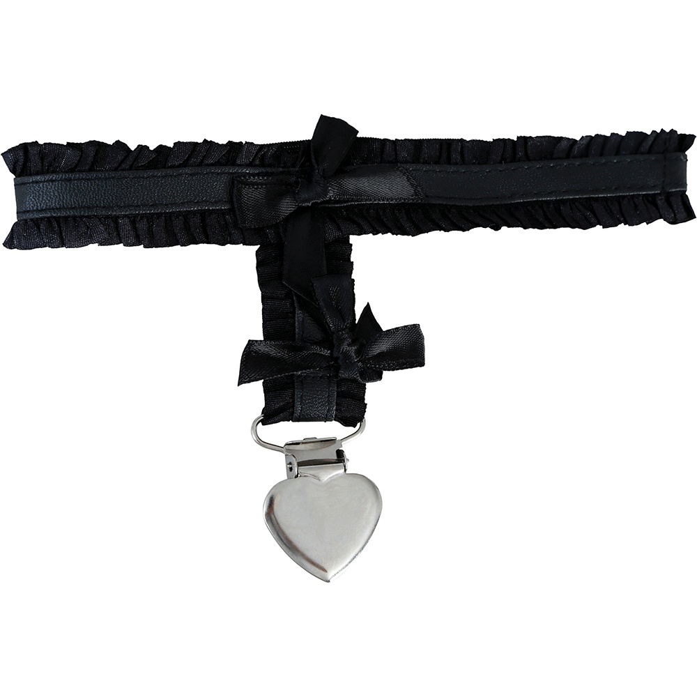 Elegante liga negra ajustable pensada para mujer, con volantes y lazo decorativo que aportan un toque romántico. La pinza metálica incluye un colgante en forma de corazón para un acabado coqueto y llamativo. Diseño cómodo y adaptable que sujeta de forma segura sin comprometer la estética. Fabricada con poliéster y detalles metálicos para un look sofisticado.