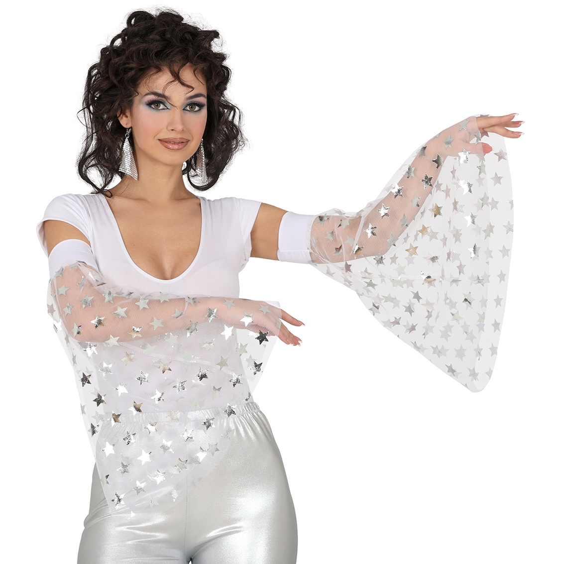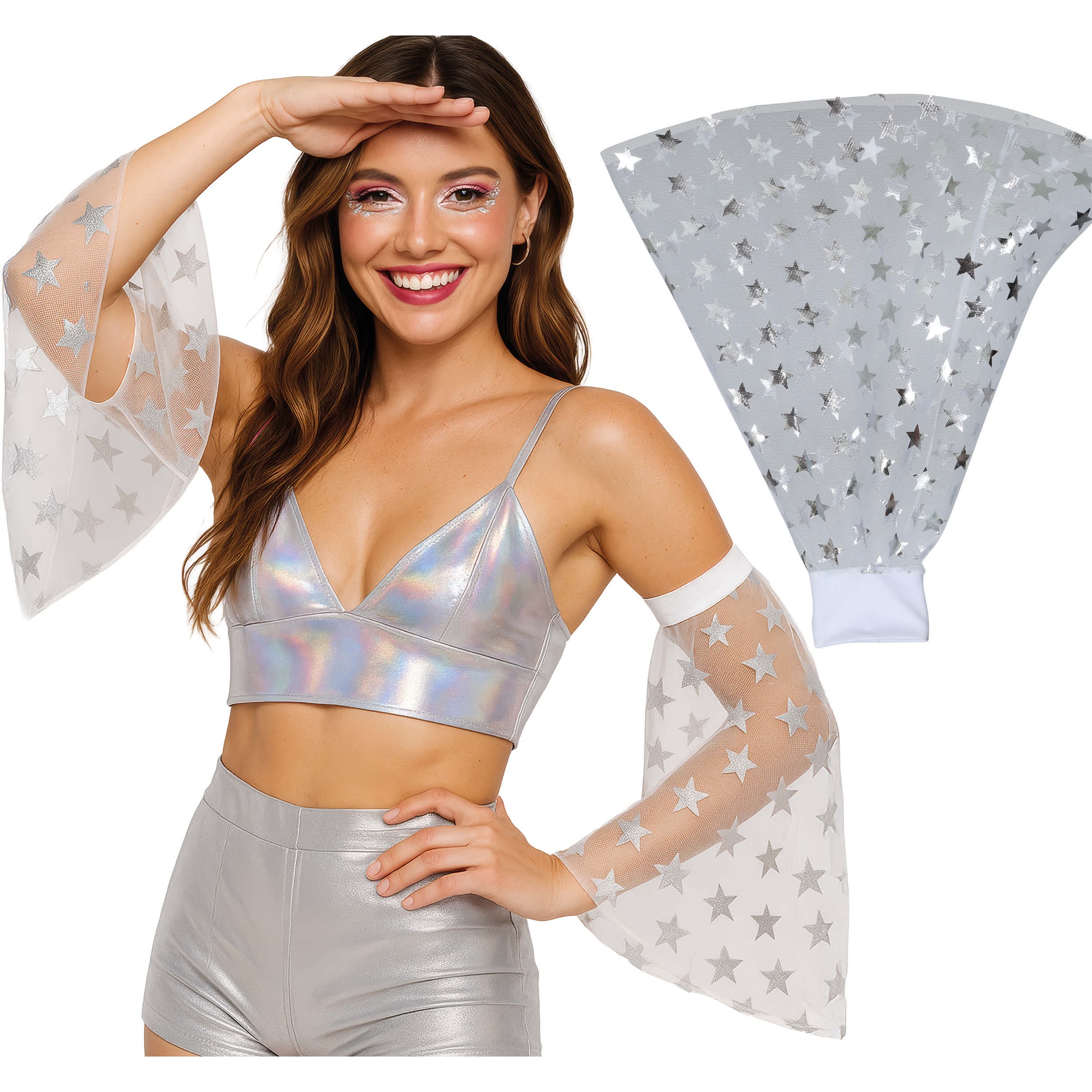 Estampado de estrellas plateadas que refleja la luz y crea un efecto llamativo sobre el escenario.