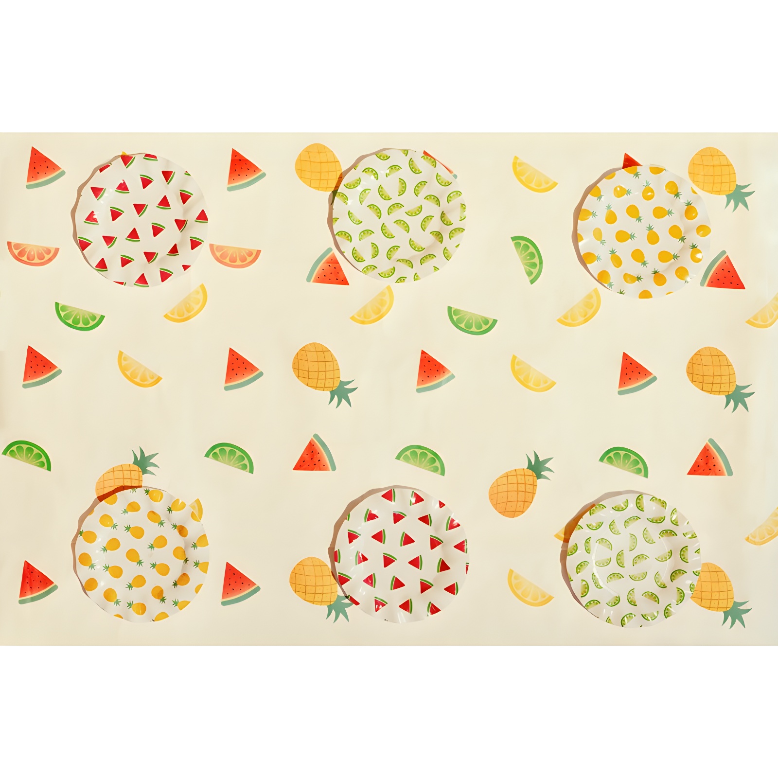 Este mantel desechable presenta un alegre estampado de frutas sobre un fondo beige que aporta un toque fresco y colorido a cualquier mesa.