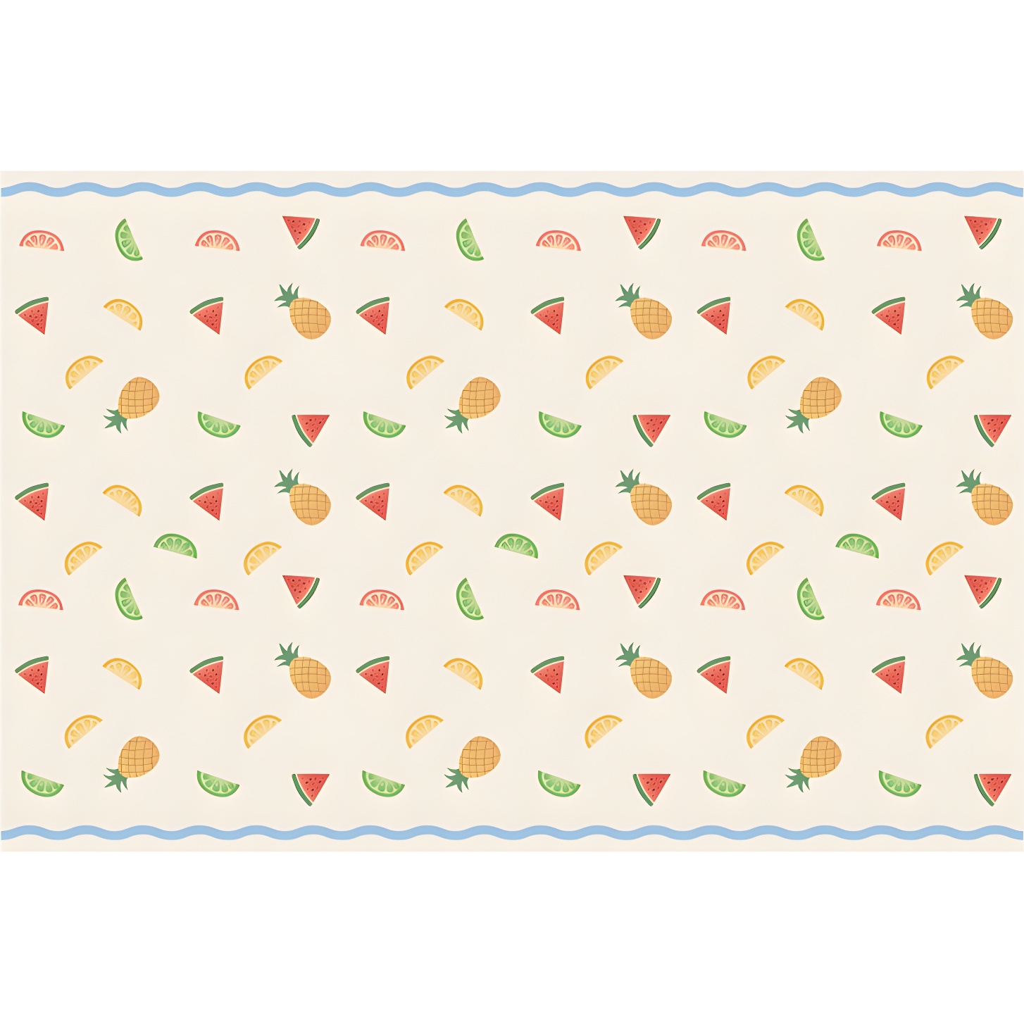 - Estampado veraniego con motivos de piña, sandía y cítricos sobre fondo beige.
