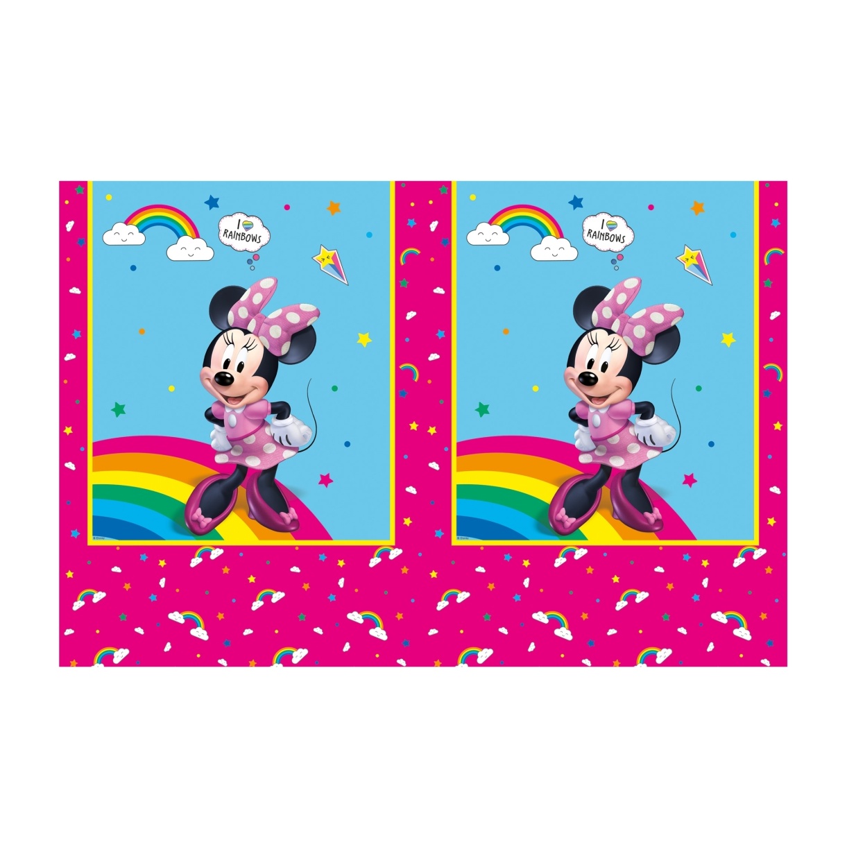 Decorativo mantel con el icónico diseño de Minnie Mouse y arcoíris que aporta color y diversión a las mesas infantiles.