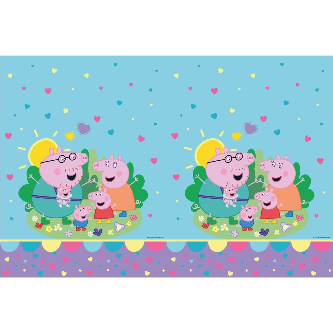 Mantel plástico decorativo con el alegre diseño de Peppa Pig y motivos de corazones, ideal para ambientar celebraciones infantiles.