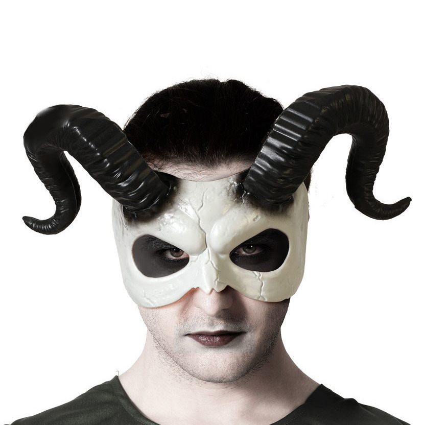 • Antifaz blanco agrietado con cuernos largos negros y mirada penetrante. Ideal para disfraces de demonio, criatura mágica o fauno oscuro.