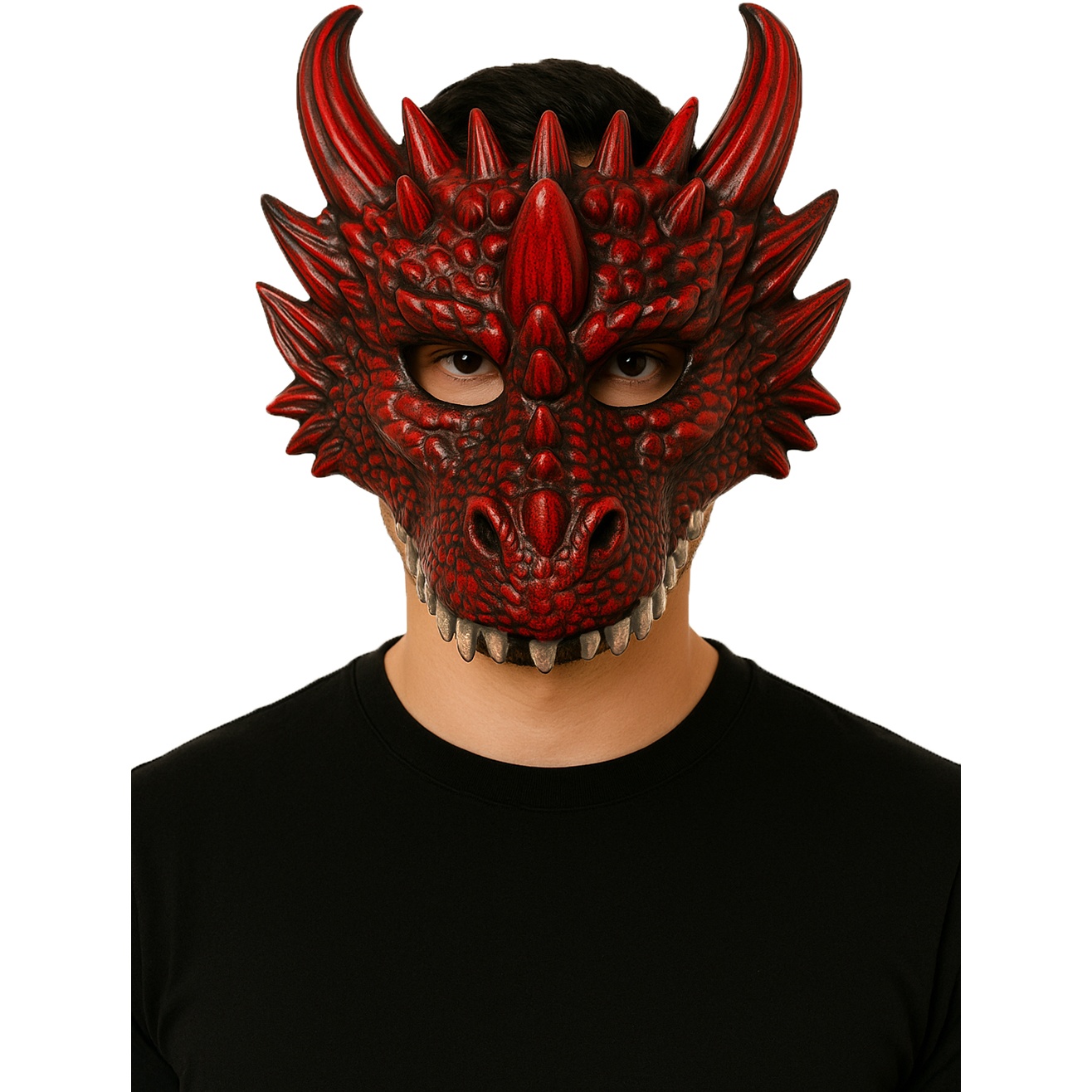 Máscara media de dragón en intenso color rojo, perfecta para completar cualquier look de fantasía o temática fantástica.