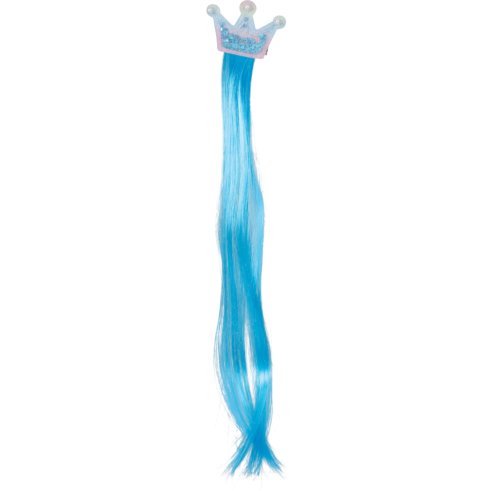 Mechón de PVC azul con clip en forma de corona que aporta un toque divertido y de fantasía al peinado. Mide 35 cm y se coloca fácilmente con un clip seguro, sin necesidad de accesorios adicionales. Su color y brillo realzan cualquier look para fiestas y celebraciones. Ligero y cómodo para llevar durante todo el evento.