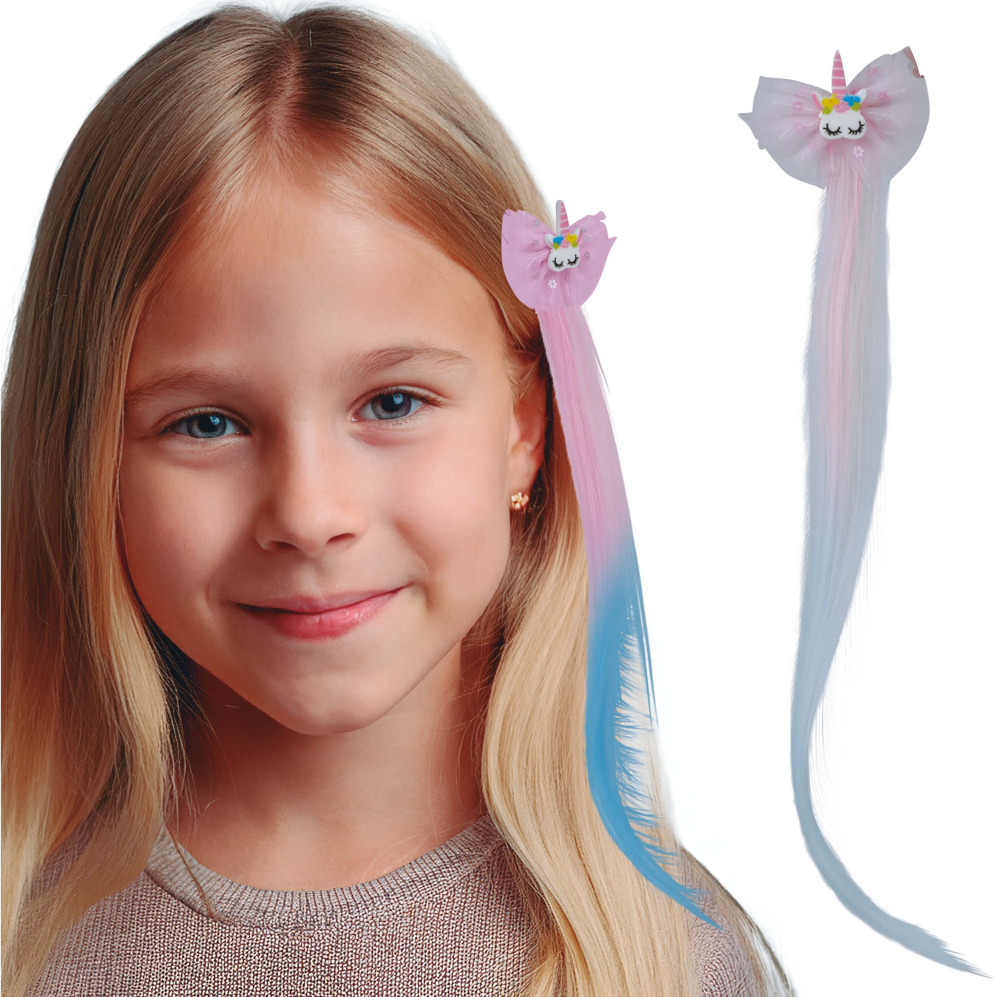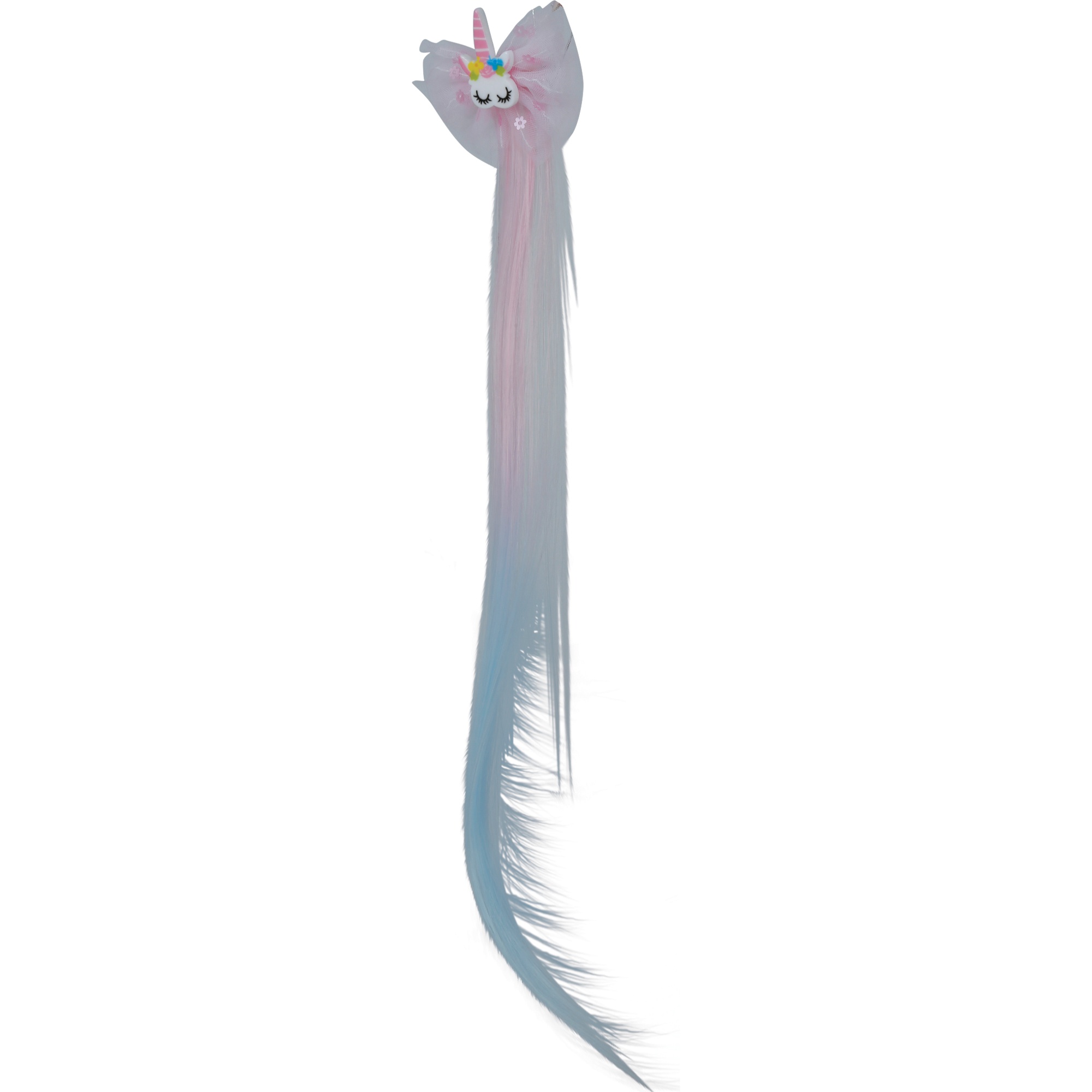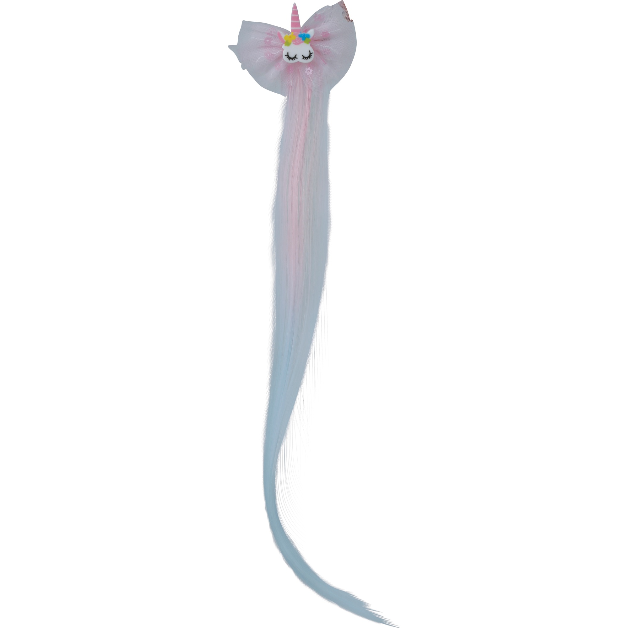 Mechón decorativo de 35 cm con un diseño de unicornio y lazo que añade un toque de fantasía al peinado.
