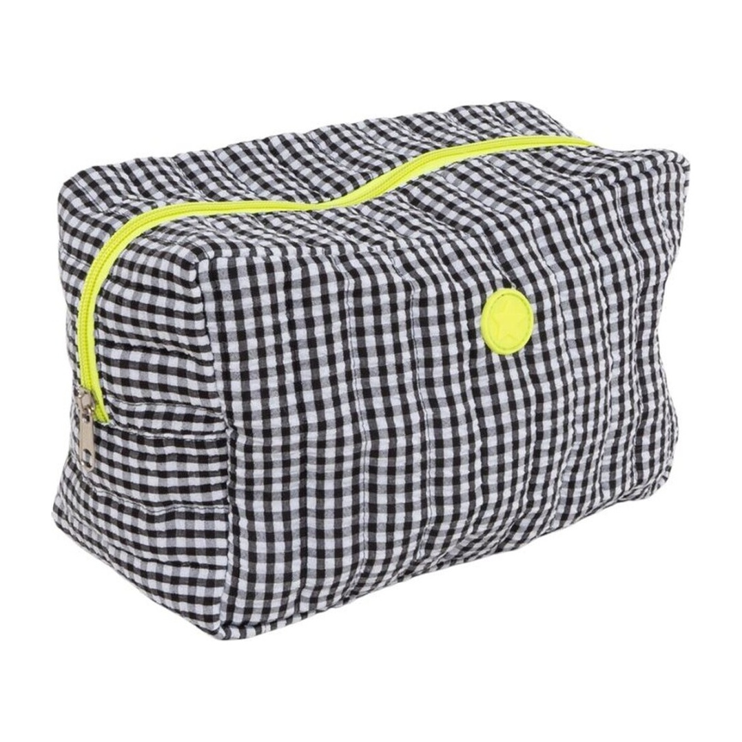 Neceser con patrón vichy en blanco y negro combinado con una cremallera en color fluor que aporta un toque moderno y llamativo. Diseño amplio y rectangular pensado para organizar cosméticos y accesorios con facilidad. Ligero y versátil, combina con cualquier equipaje y resulta práctico tanto para el día a día como para viajes.