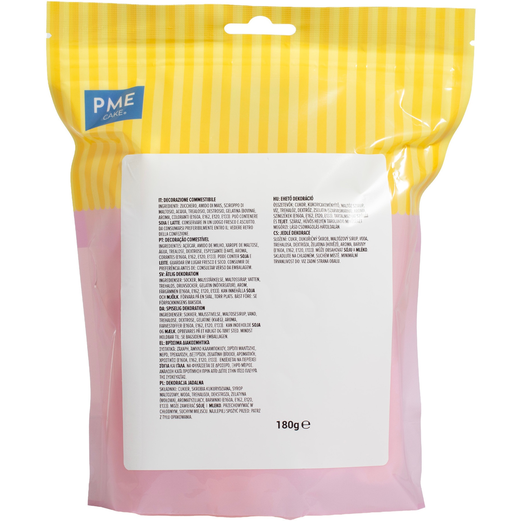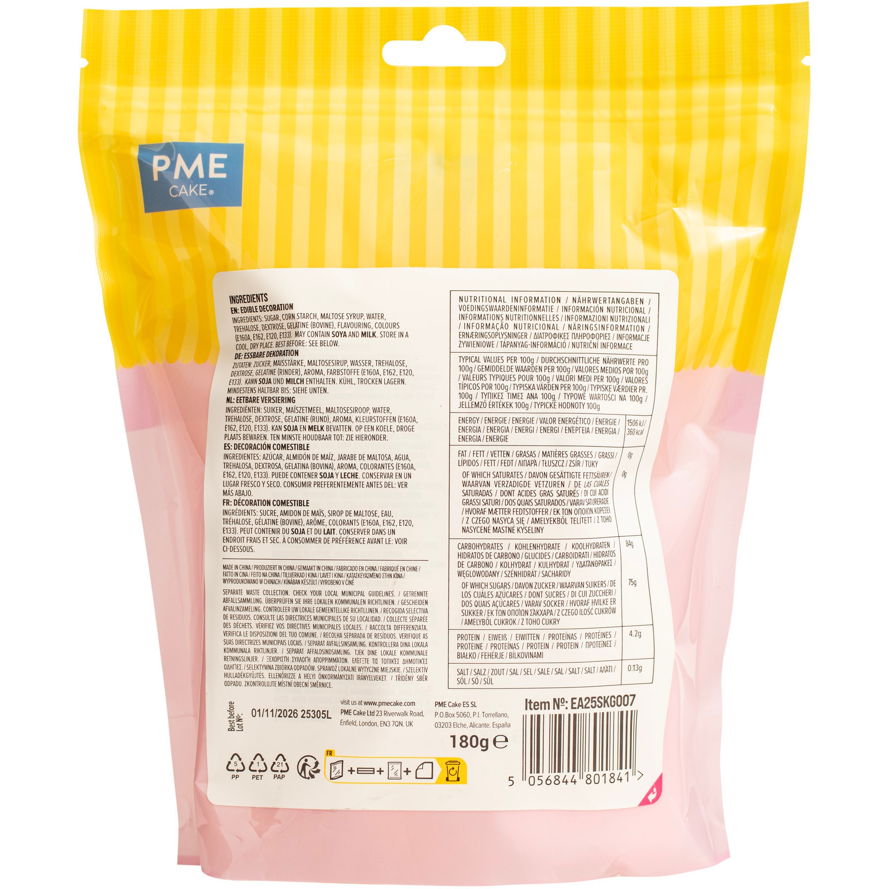 Ingredientes: azúcar, almidón de maíz, jarabe de maltosa, agua, trehalosa, dextrosa, gelatina (bovina), aroma, colorantes (E160A, E162, E120, E133).