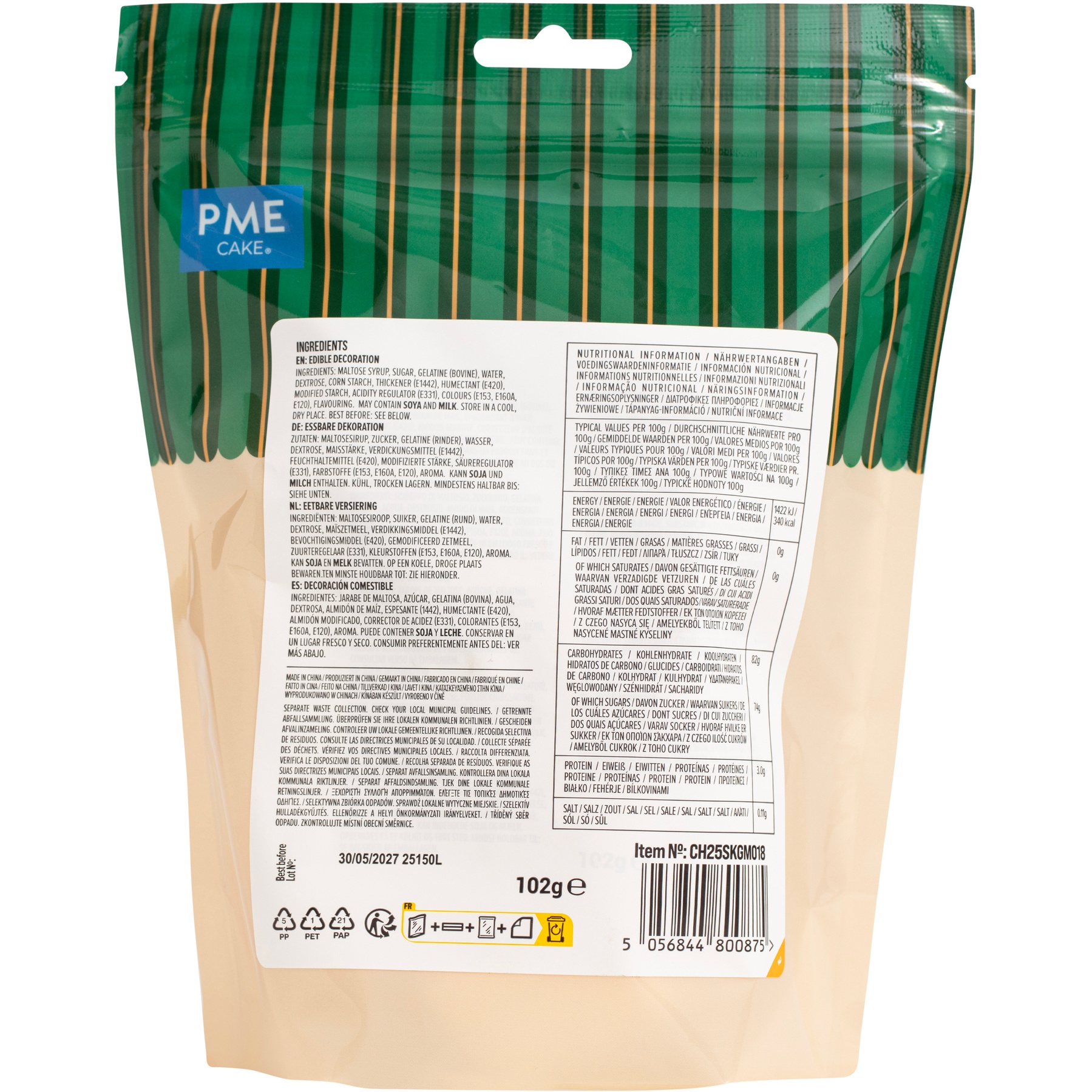Ingredientes: jarabe de maltosa, azúcar, gelatina (bovina), agua, dextrosa, almidón de maíz, espesante (1442), humectante (E420), almidón modificado, corrector de acidez (E331), colorantes (E153, E160A, E120), aroma.