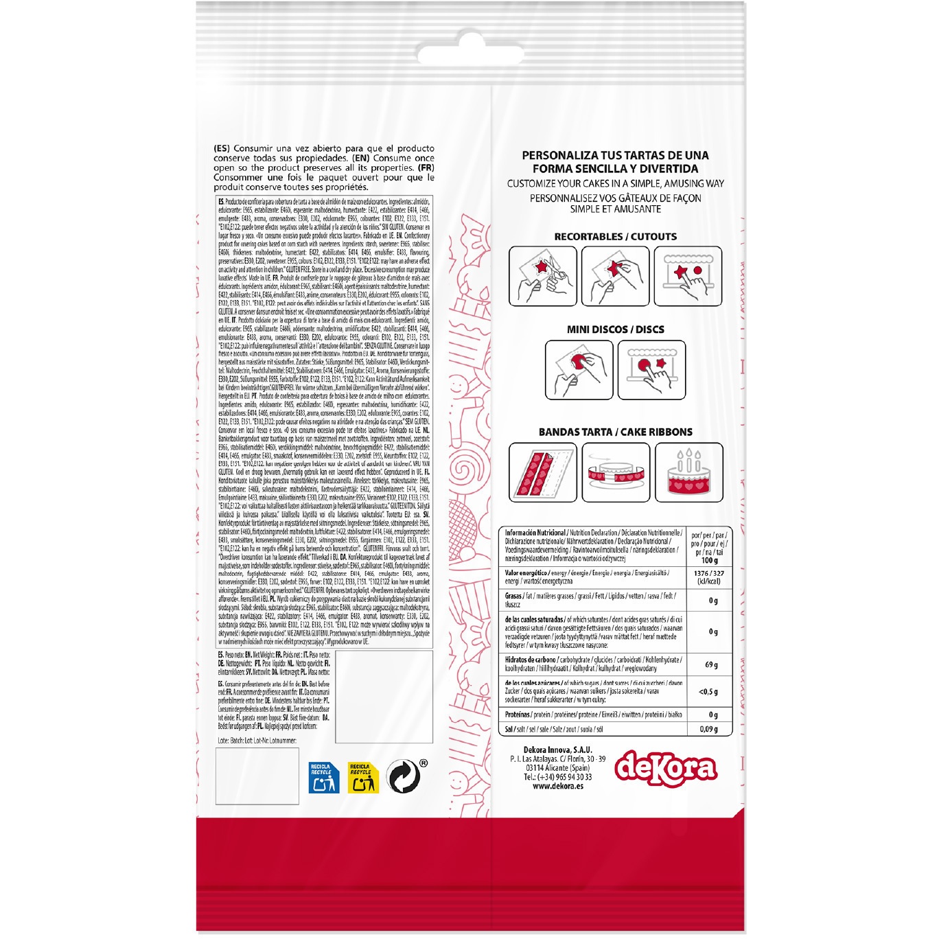 Ingredientes: Almidón, aroma, humectante (E422), emulgentes (E433), estabilizantes (E414, E460i, E466), conservantes (E202, E330), edulcorantes (E955, E965) espesante (maltodextrina), colorantes (E102, E122, E133, E151).
