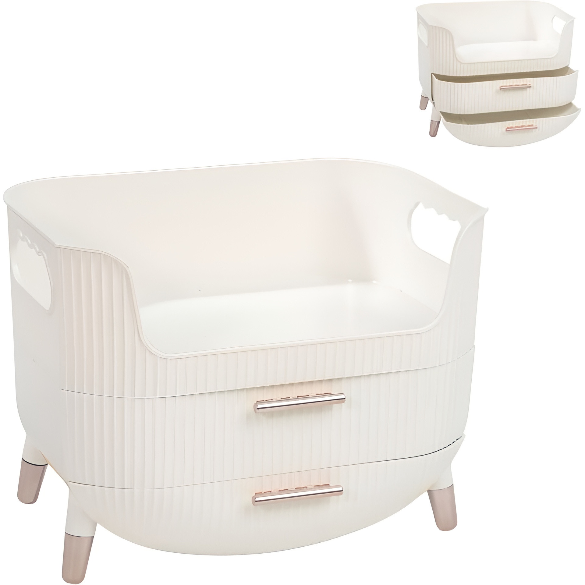 Organizador de sobremesa diseñado para mantener tu tocador ordenado con estilo nórdico. Cuenta con dos cajones espaciosos y patas elevadas que aportan un aire moderno y práctico.