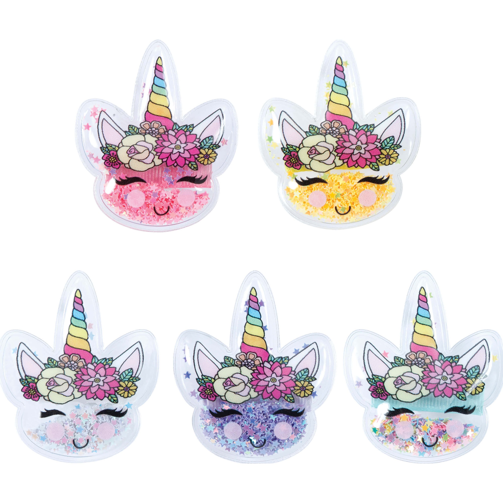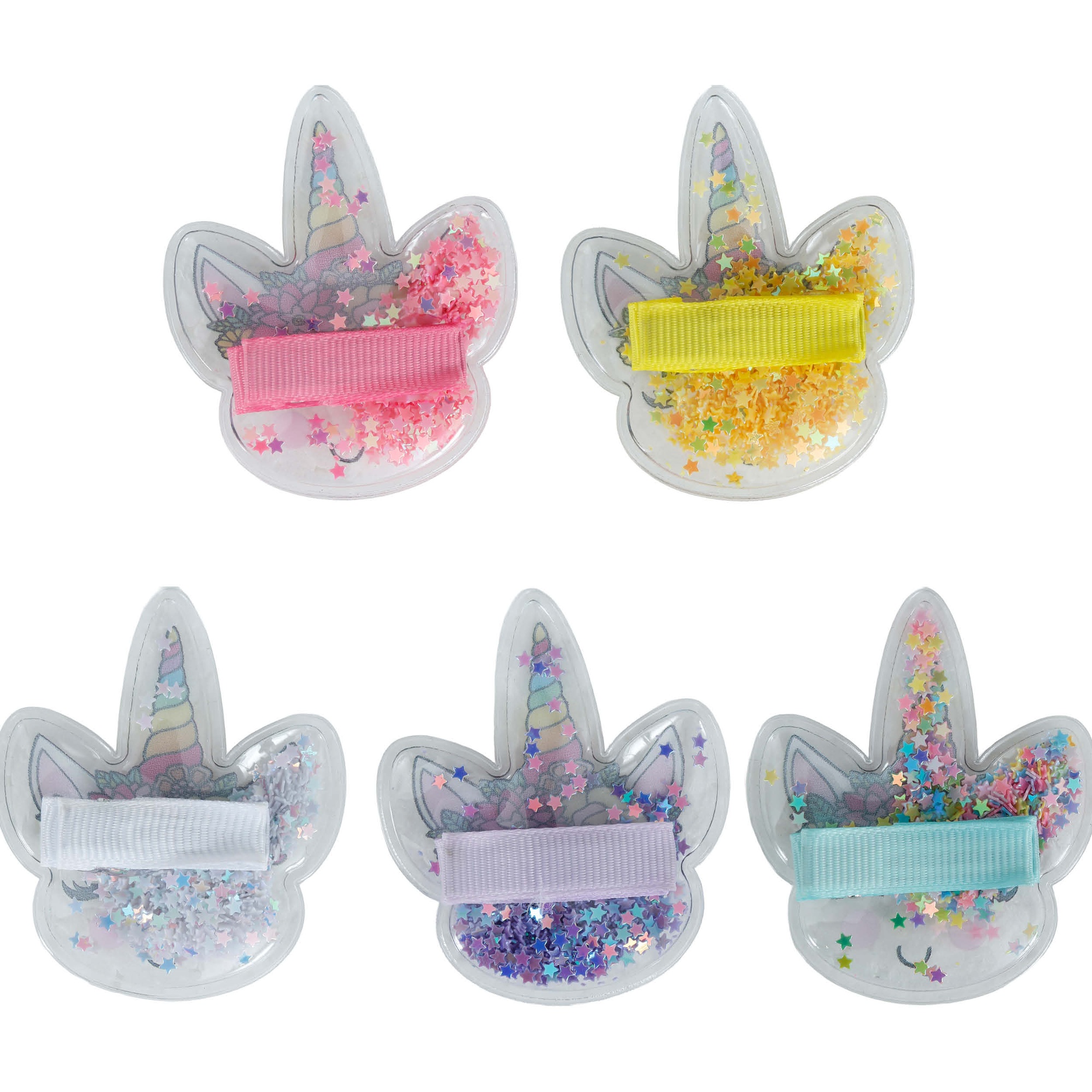 Pack de 12 pinzas para el cabello con divertidos diseños de unicornio, perfectas para niñas y como detalle en fiestas infantiles. Cada pinza tiene un acabado con purpurina y efecto "shaker" que atrae todas las miradas.
