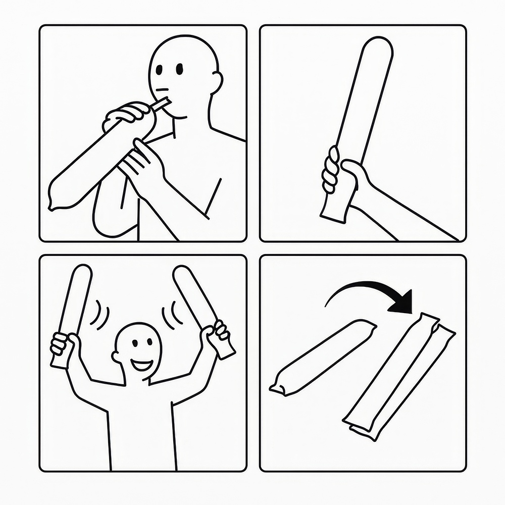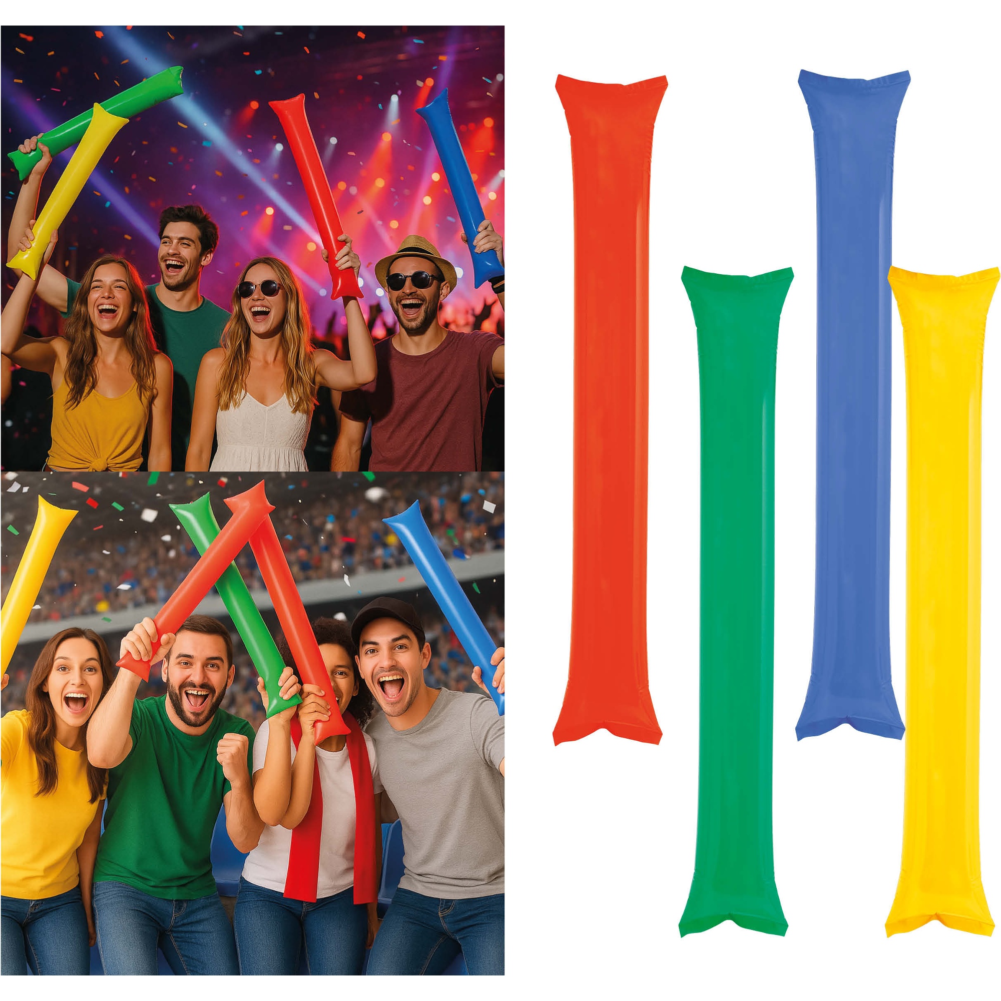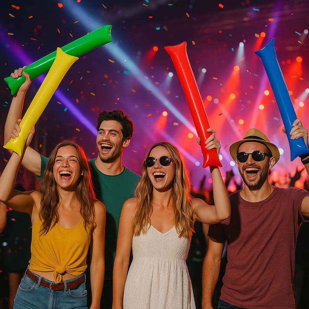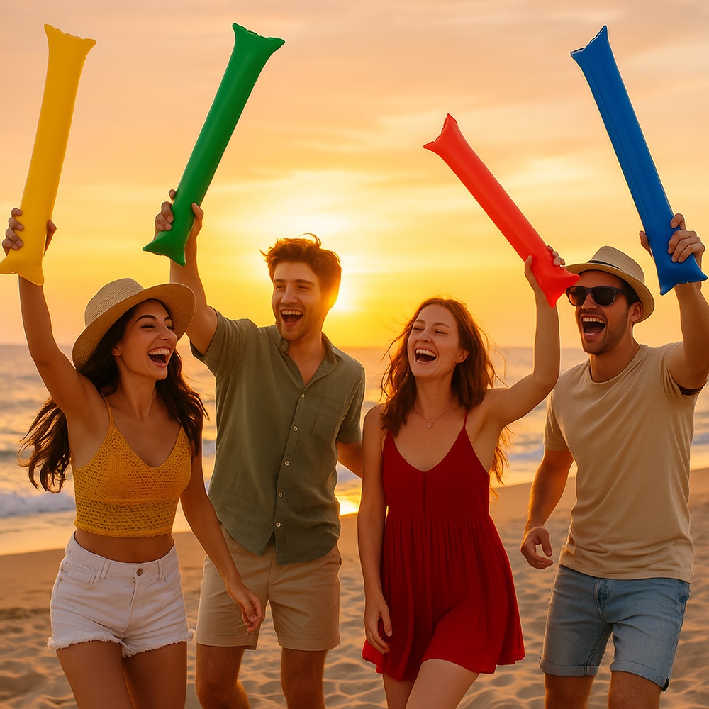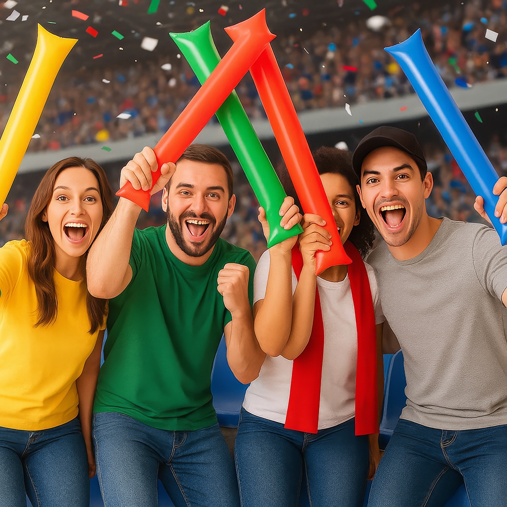 Anima tus partidos y celebraciones con estos palos hinchables de colores surtidos. Diseñados para crear ambiente y producir un sonido llamativo al chocar entre sí, son ideales para estadios, peñas, conciertos y fiestas. Se inflan de forma rápida y son ligeros para llevar y usar durante todo el evento. Colores vivos y material resistente que los hacen perfectos para animar en grupo.