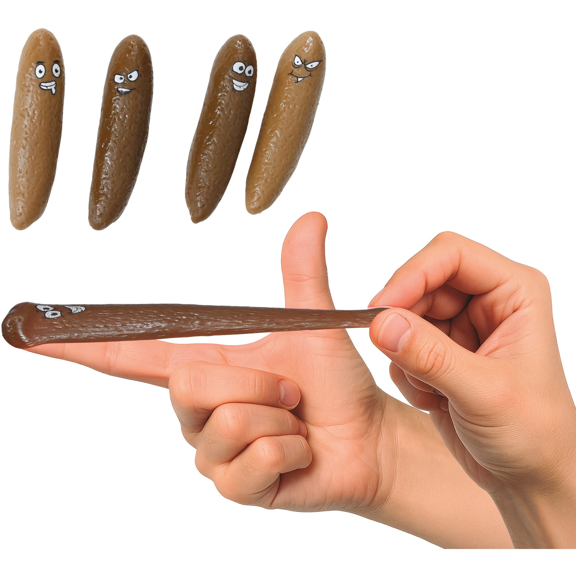 Divertidísimo pack de 4 excrementos voladores en látex con expresiones cómicas para bromas instantáneas.