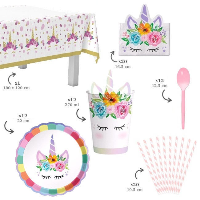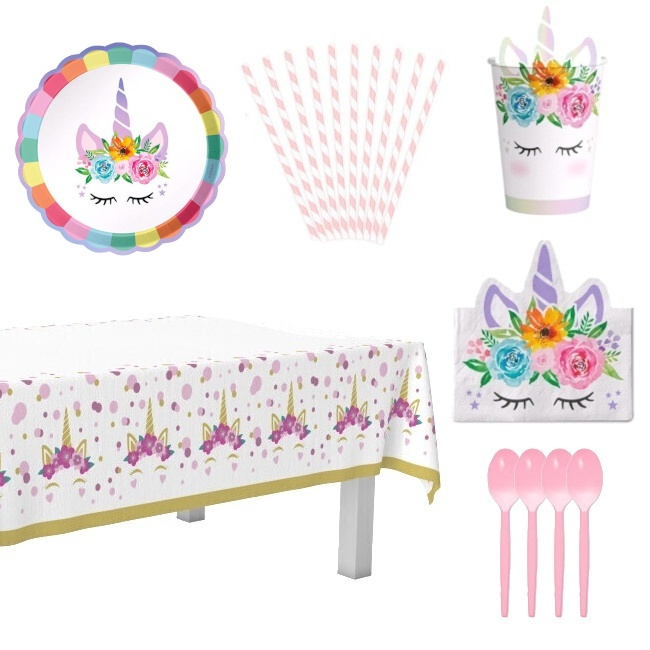 Es un pack con todo lo necesario para disfrutar de una fiesta de temática de unicornios.