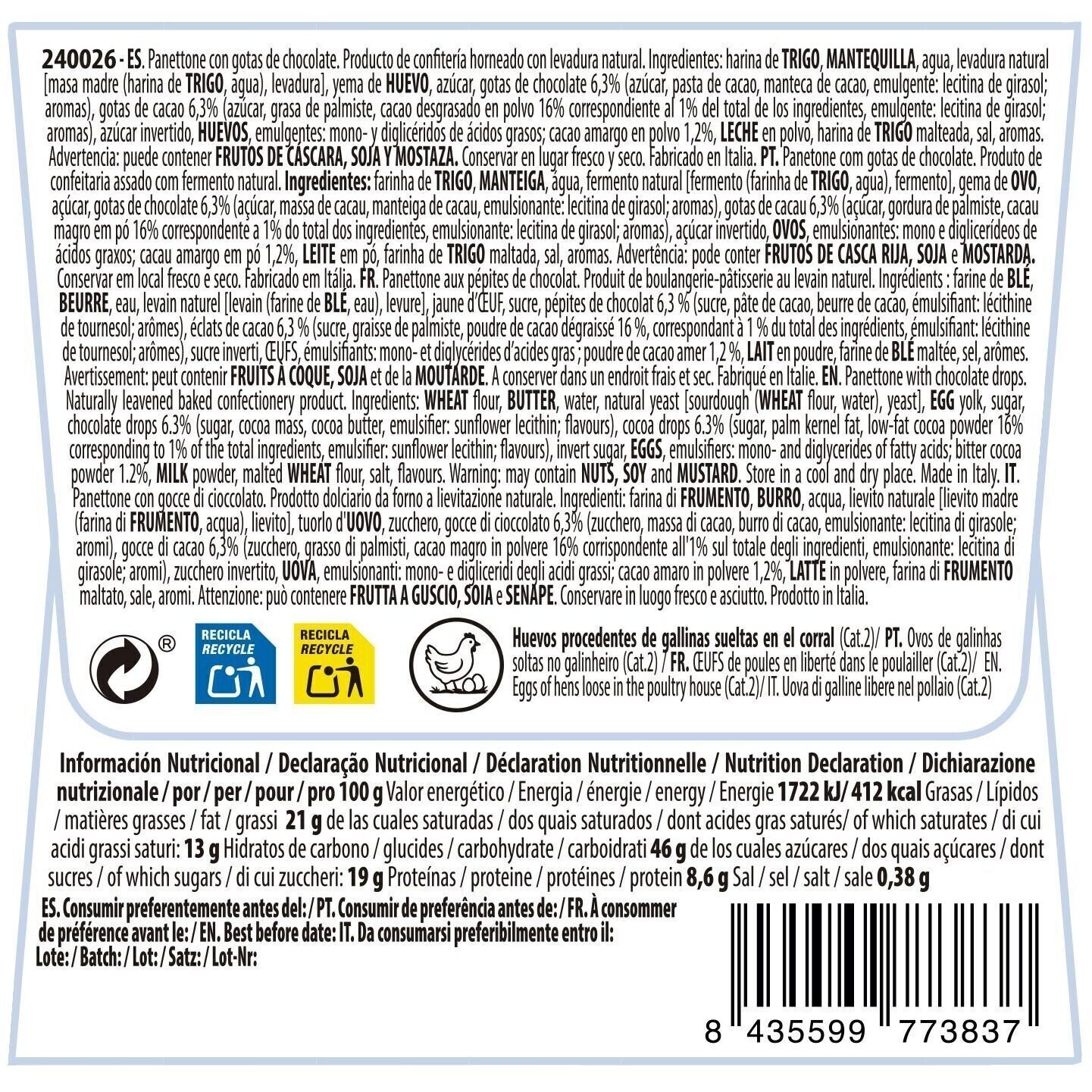 - Alérgenos: Cereales con gluten y derivados, Frutos de cáscara y derivados, Huevo y derivados, Leche incluida lactosa y derivados, Mostaza y derivados, Soja y derivados.