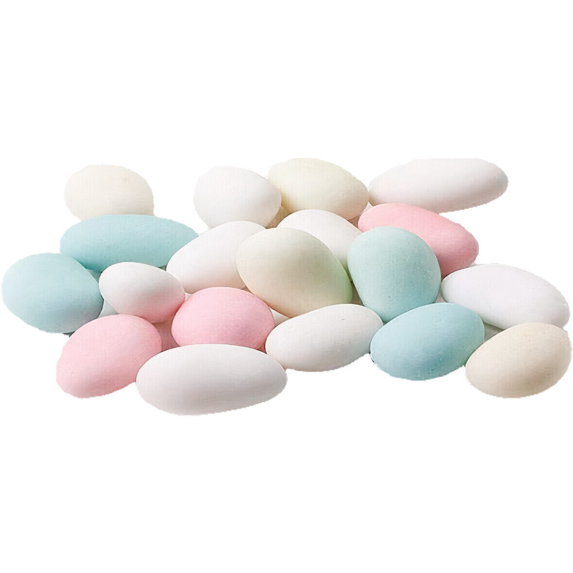 Ingredientes: cobertura de azúcar (85%), (azúcar,harina de arroz, jarabe de glucosa, almidón de arroz, agente de recubrimiento: goma arabiga, colorantes: E100, E120, E132) y almendras (15%).
