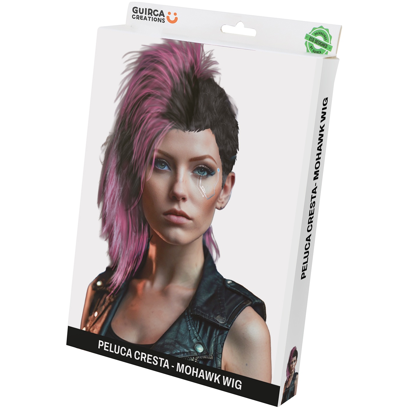Peluca cresta punk en llamativo contraste rosa y negro, diseñada para un estilo atrevido y moderno.