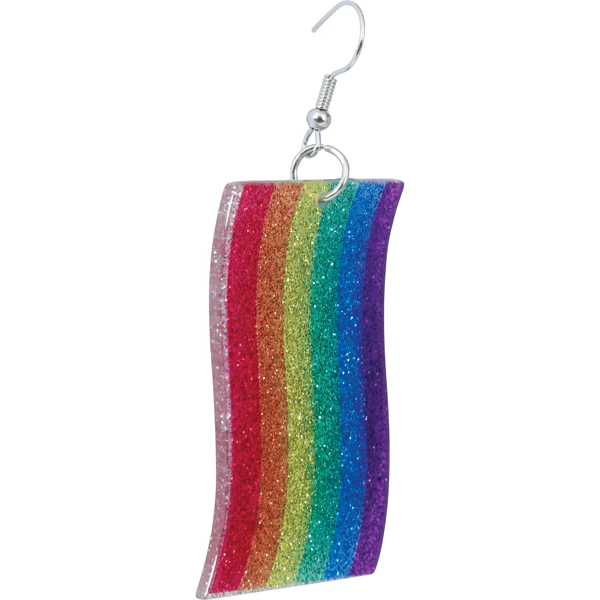 Pendientes llamativos con franjas en colores arcoíris y acabado con purpurina brillante. Su diseño ondulado aporta movimiento y un toque alegre a cualquier look de fiesta. Son ligeros y cómodos, pensados para llevar durante horas sin molestias. El gancho metálico facilita su colocación y asegura una sujeción estable.