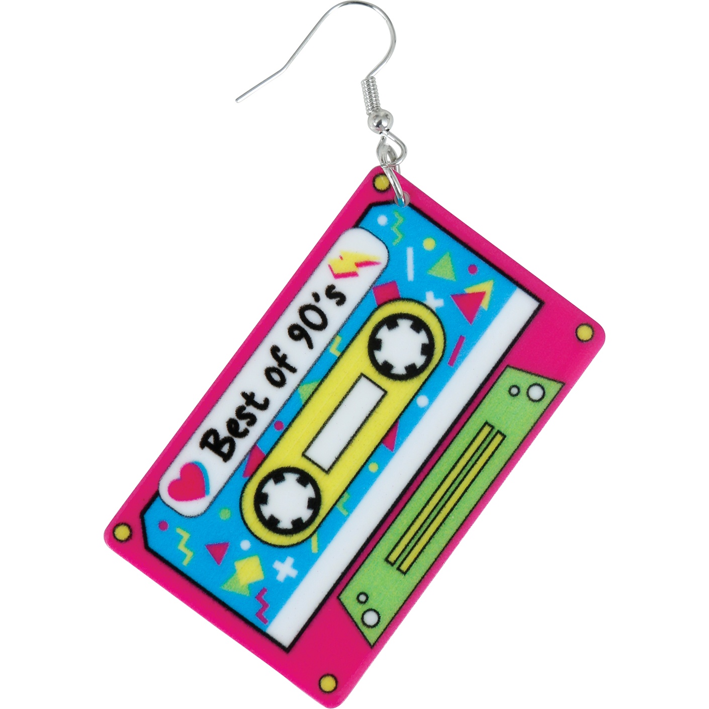 Pendientes con diseño cassette inspirado en la estética pop de los años 90. Los colores vivos y los detalles recrean la apariencia de una cinta de casete clásica para un toque vintage y divertido. Fabricados en metal y PVC, son ligeros y cómodos de llevar. Cierre de gancho fácil de colocar y diseño llamativo que realza cualquier look.