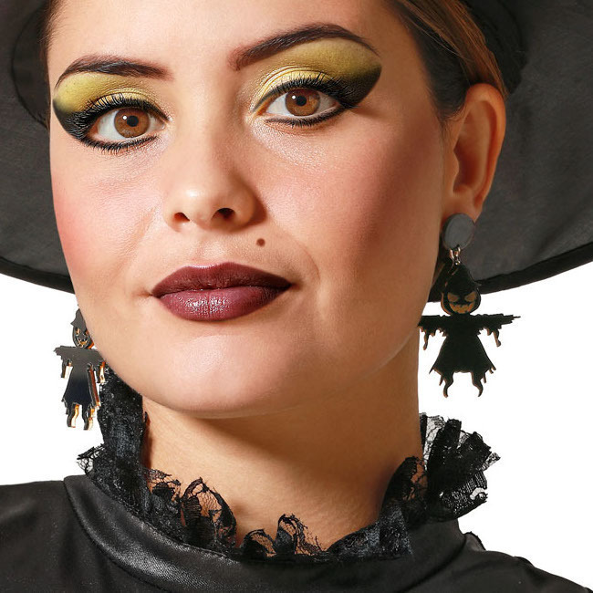 • Pendientes con figura de espantapájaros negro, ideales para disfraces de terror rural.