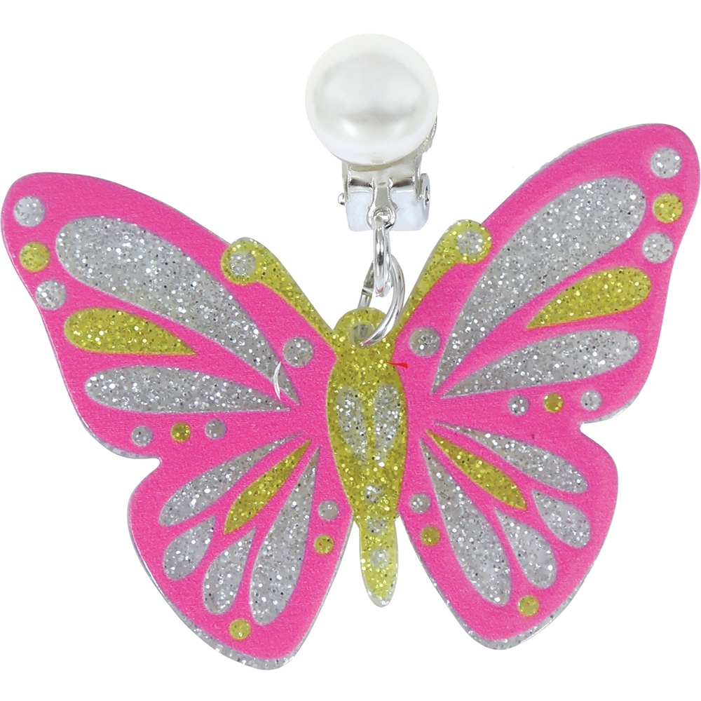 Encantadores pendientes con diseño de mariposa pensados para niñas. Destacan por su color rosa y detalles con purpurina que aportan un toque festivo y brillante. Son ligeros y cómodos, adecuados para llevar en fiestas, cumpleaños y complementos de disfraces. Presentan un cierre tipo clip con detalle de perla, fácil de poner y seguro para las orejas no perforadas. Materiales: metal y PVC.