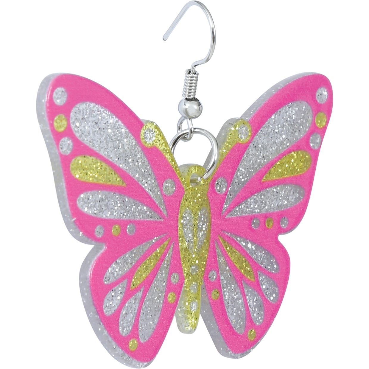 - Diseño vistoso de mariposa con purpurina y colores llamativos.