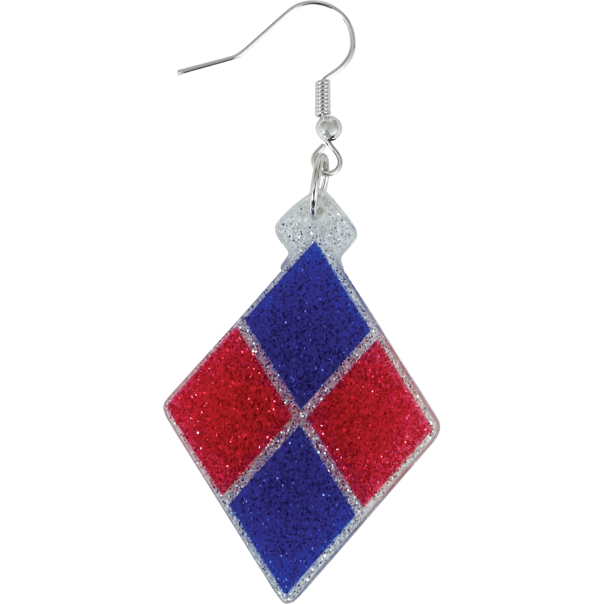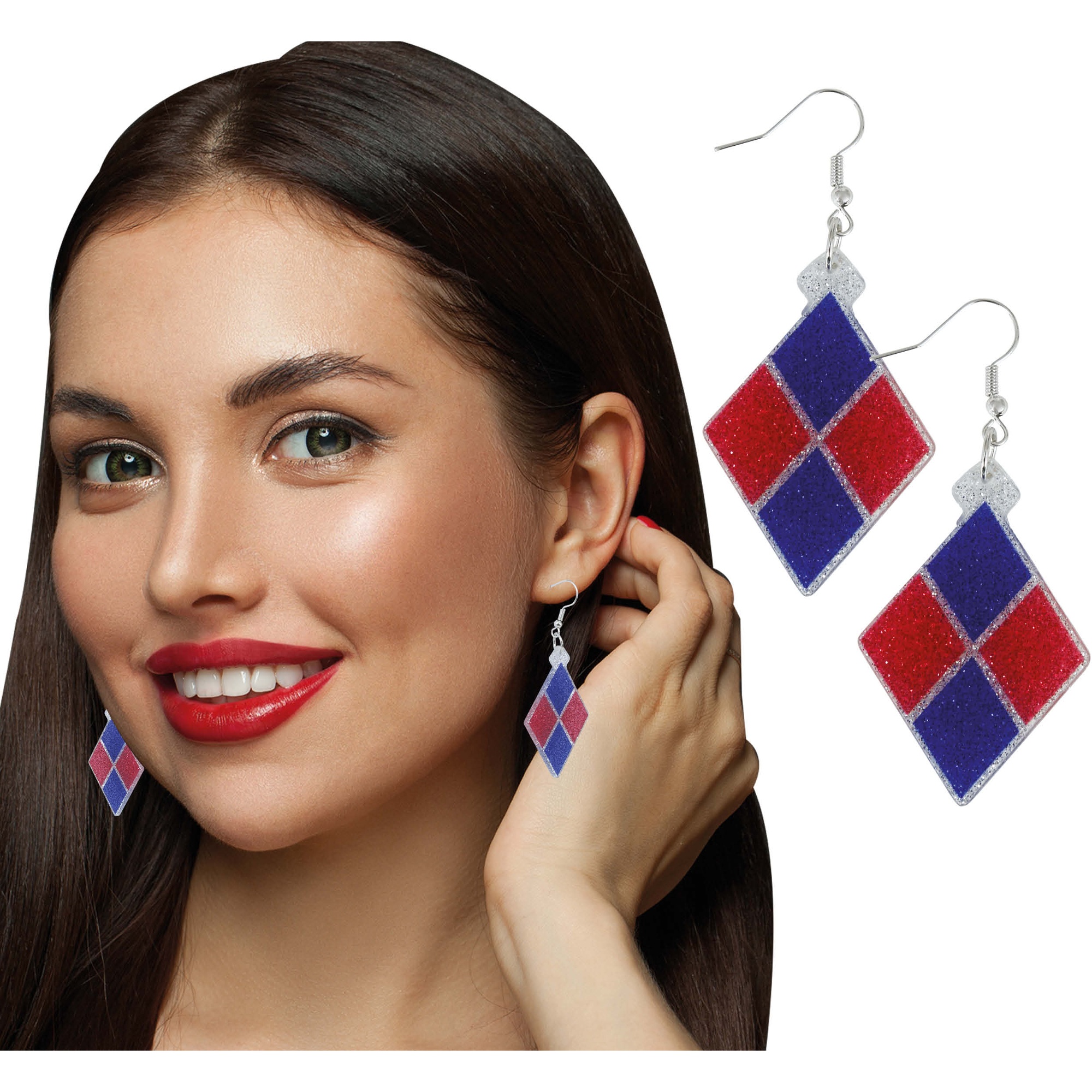 Pendientes colgantes con diseño de rombos en los clásicos colores rojo y azul, inspirados en el estilo Harley Quinn.