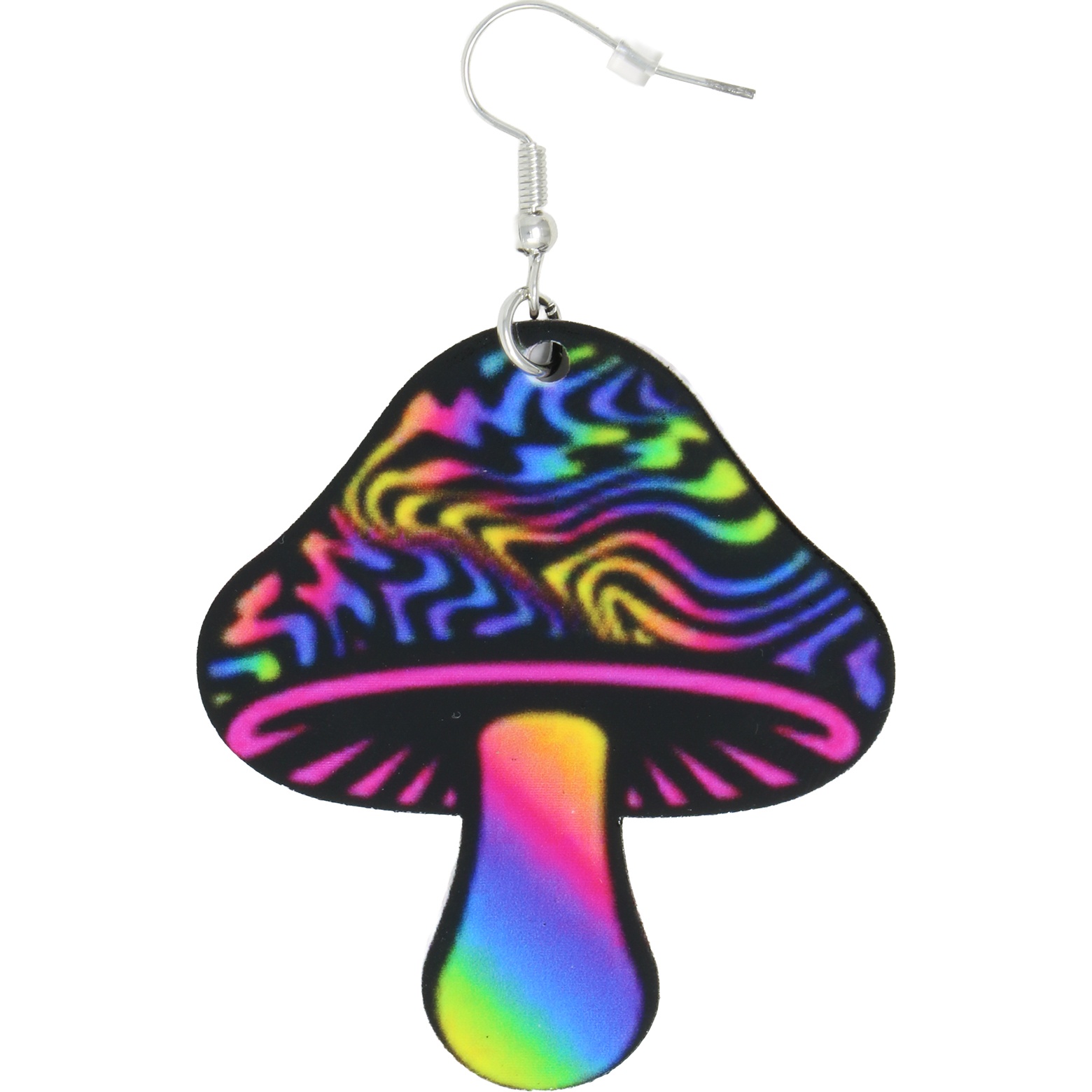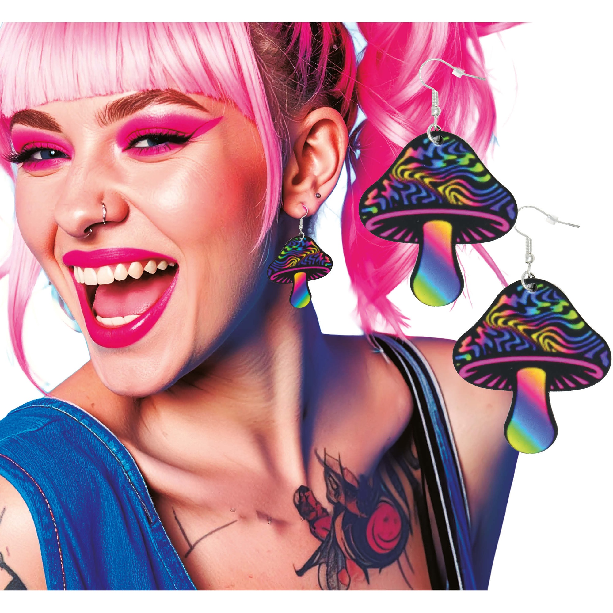 Pendientes con diseño de setas en colores psicodélicos, pensados para aportar un punto atrevido y alternativo a tu look. Fabricados en metal y PVC, combinan resistencia y ligereza para un uso cómodo. El motivo llamativo y los tonos neón hacen de estos pendientes una pieza destacada en estilismos de inspiración alternativa y festiva. Diseño con gancho clásico que facilita su colocación.