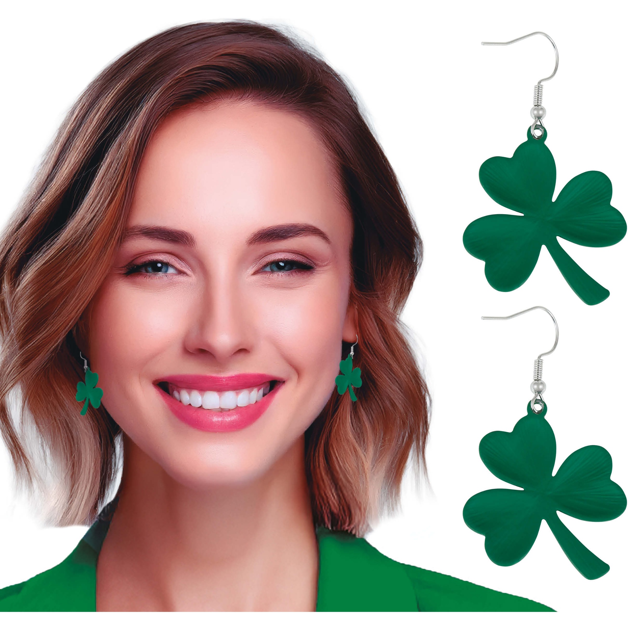 Pendientes trébol St. Patrick ideales para completar tu look en San Patricio y otras celebraciones temáticas. Diseño en color verde con forma de trébol que aporta un toque alegre y festivo. Fabricados en PVC y montados en gancho tipo fishhook, son ligeros y cómodos para llevar durante toda la fiesta. Perfectos como detalle para eventos, photocalls o como regalo divertido para amigas y familiares. Se suministran en par.