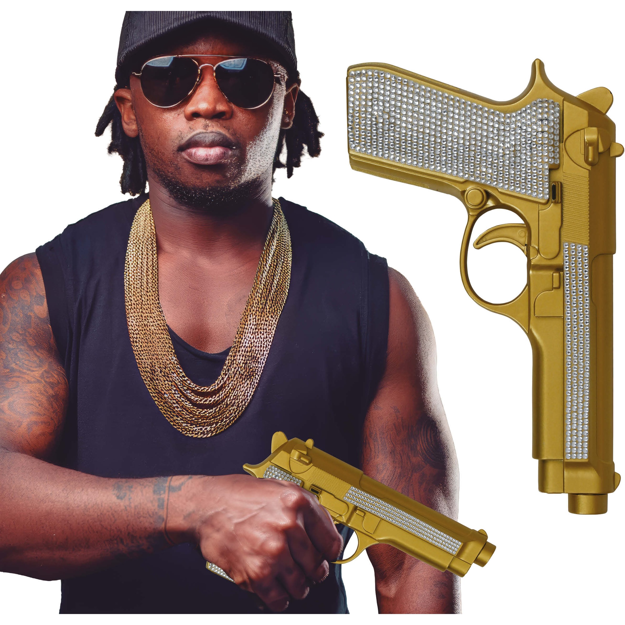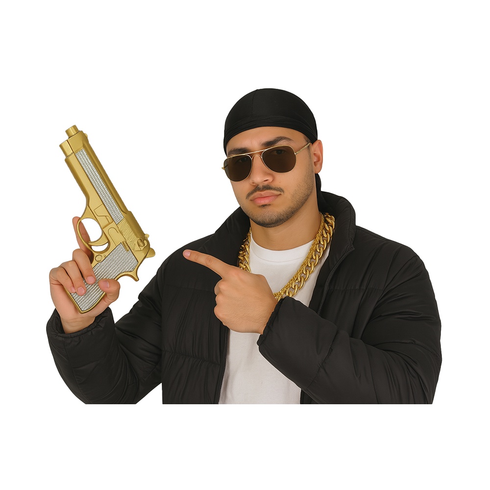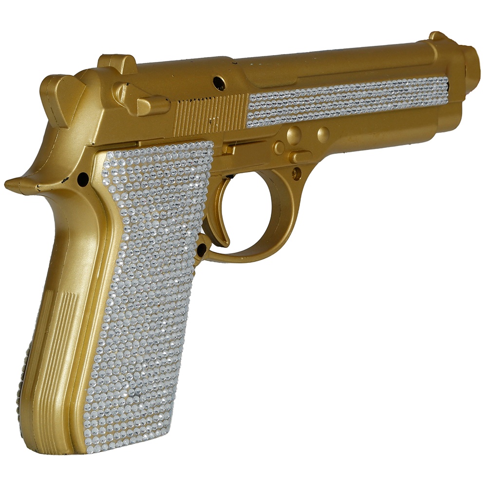 Pistola decorativa de 25 cm con acabado dorado y detalles de pedrería que aportan un toque llamativo y glamuroso.