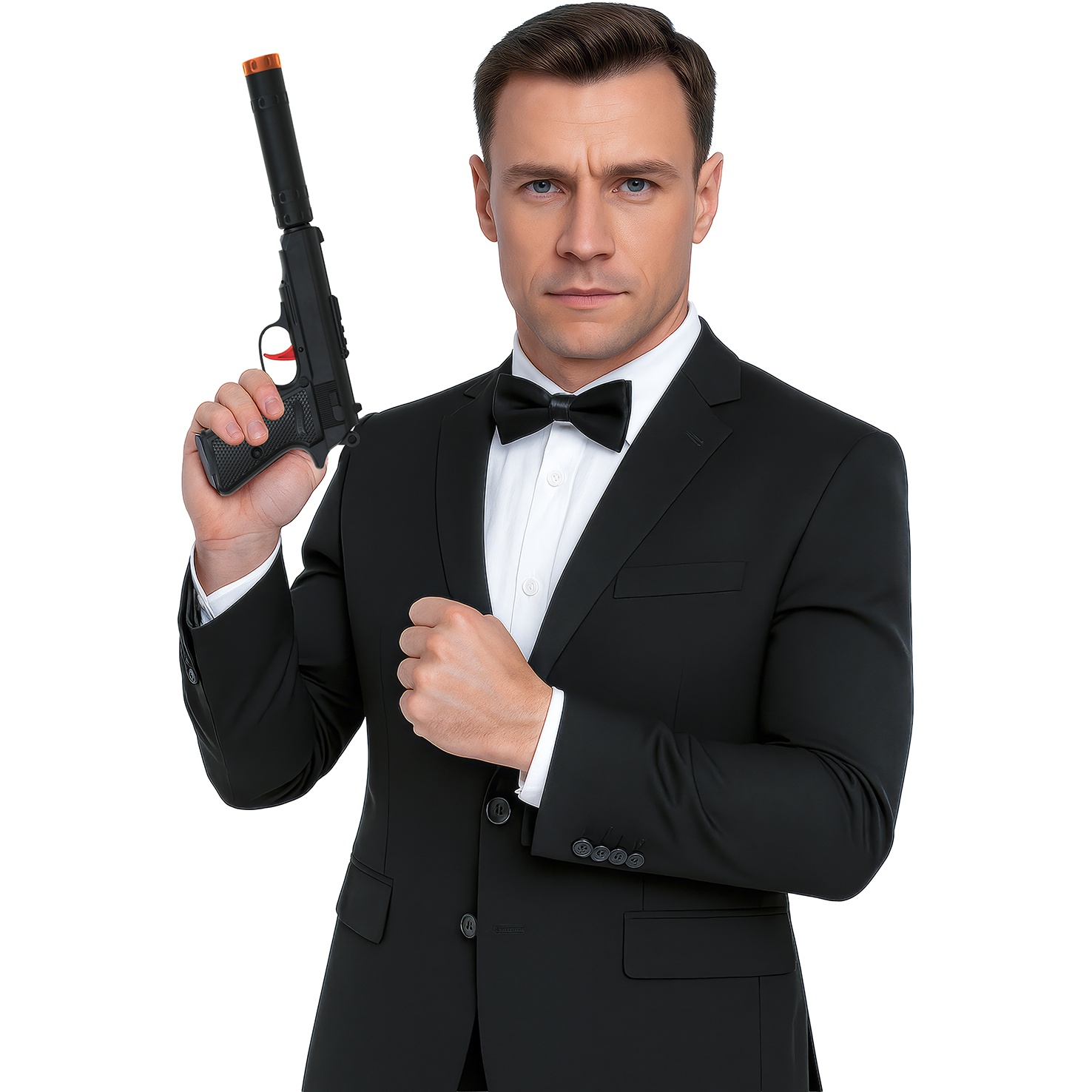 Uso exclusivo como accesorio para disfraces y decoración; no es un arma real. Perfecta para combinar con trajes formales o disfraces de espía, villano o personaje cinematográfico.
