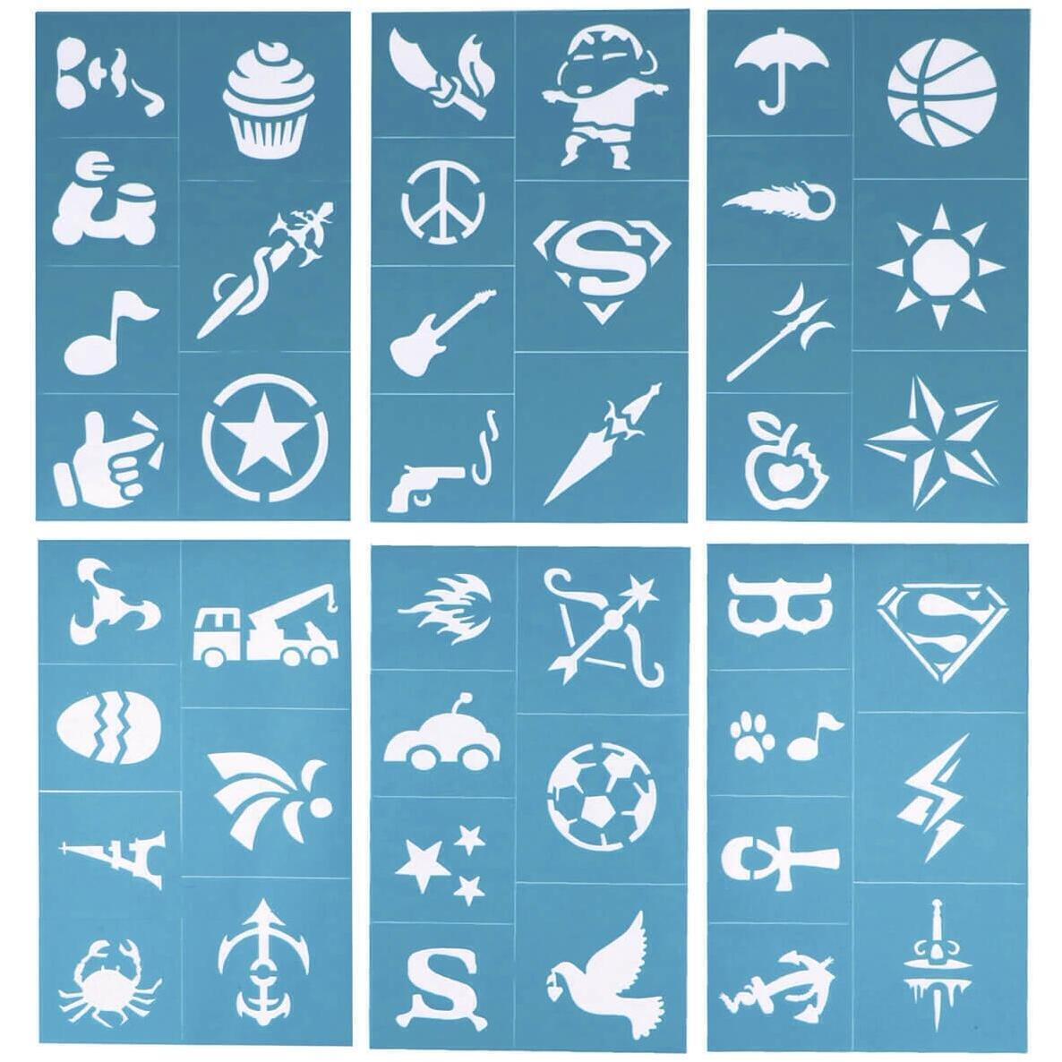 - Cada plantilla incluye adhesivo en el dorso para fijarse fácilmente sobre la piel y mantenerse estable durante la aplicación, garantizando líneas precisas y resultados nítidos.
