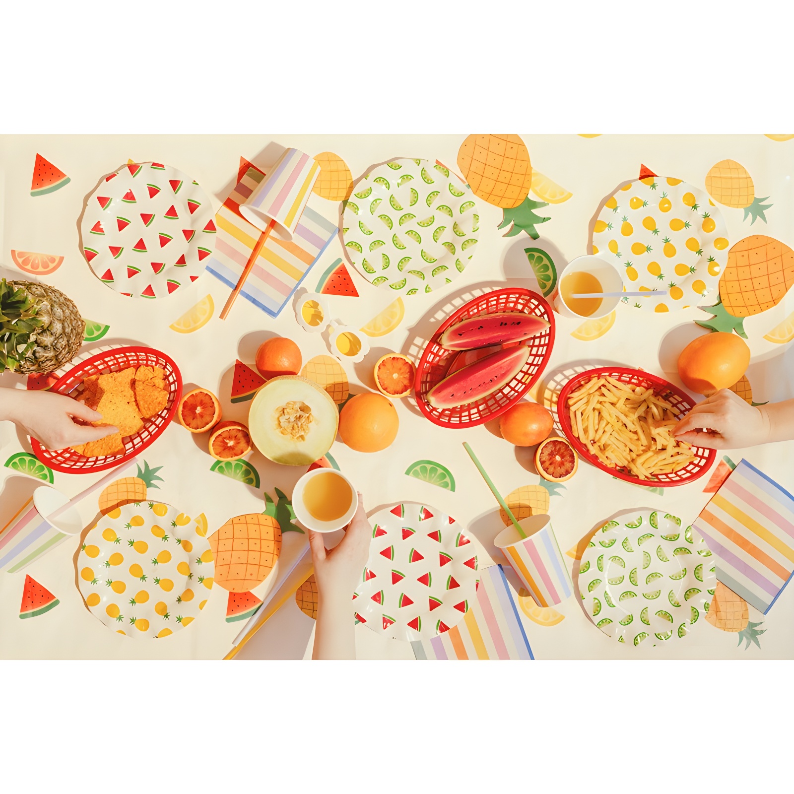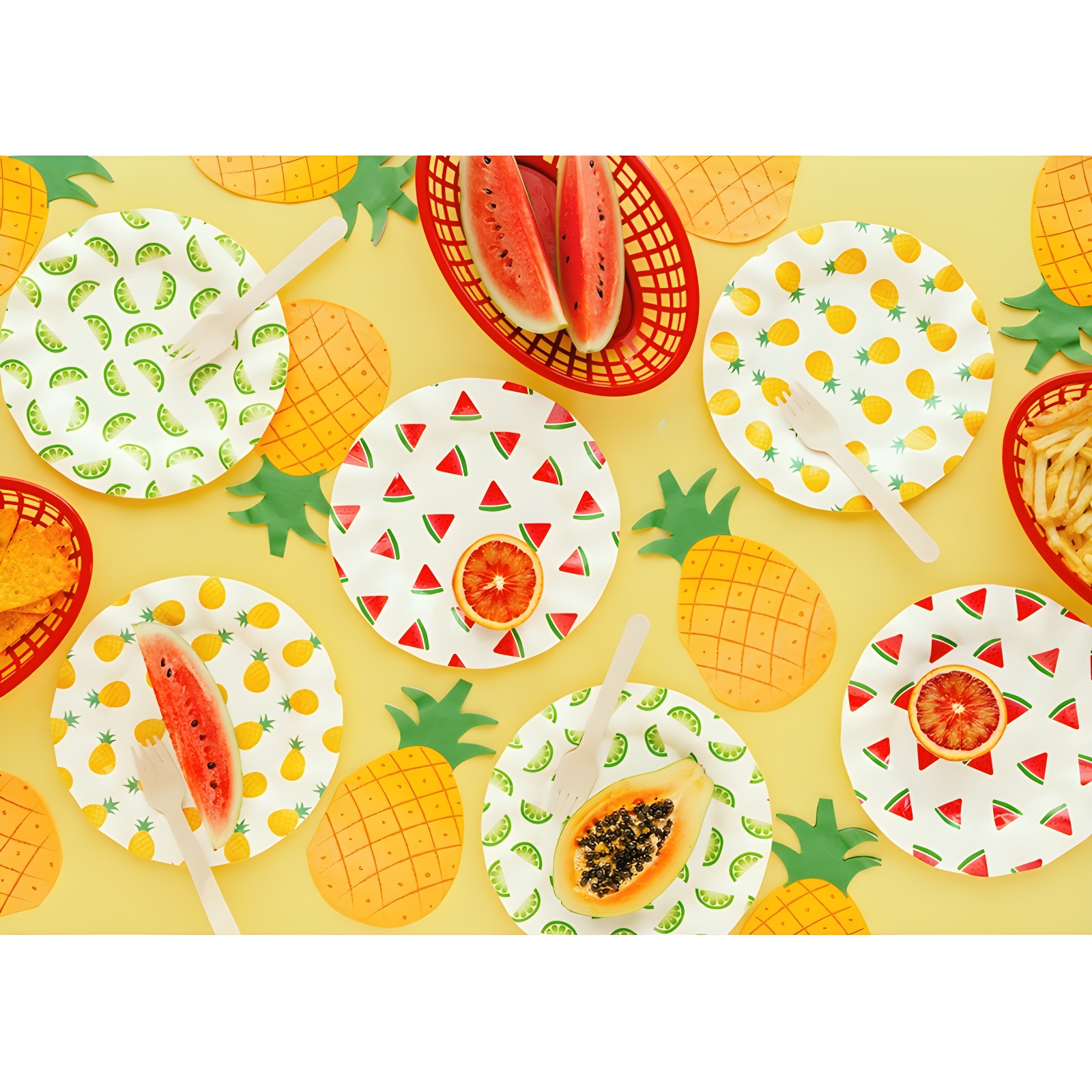 Plates Fruits combina un diseño tropical alegre con la practicidad de los platos desechables.