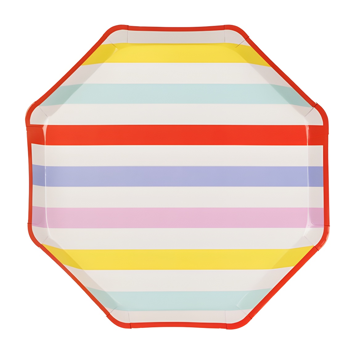 Platos de papel Stripes en beige con borde rojo y un estampado de rayas multicolor que aporta un toque alegre y moderno a la mesa.