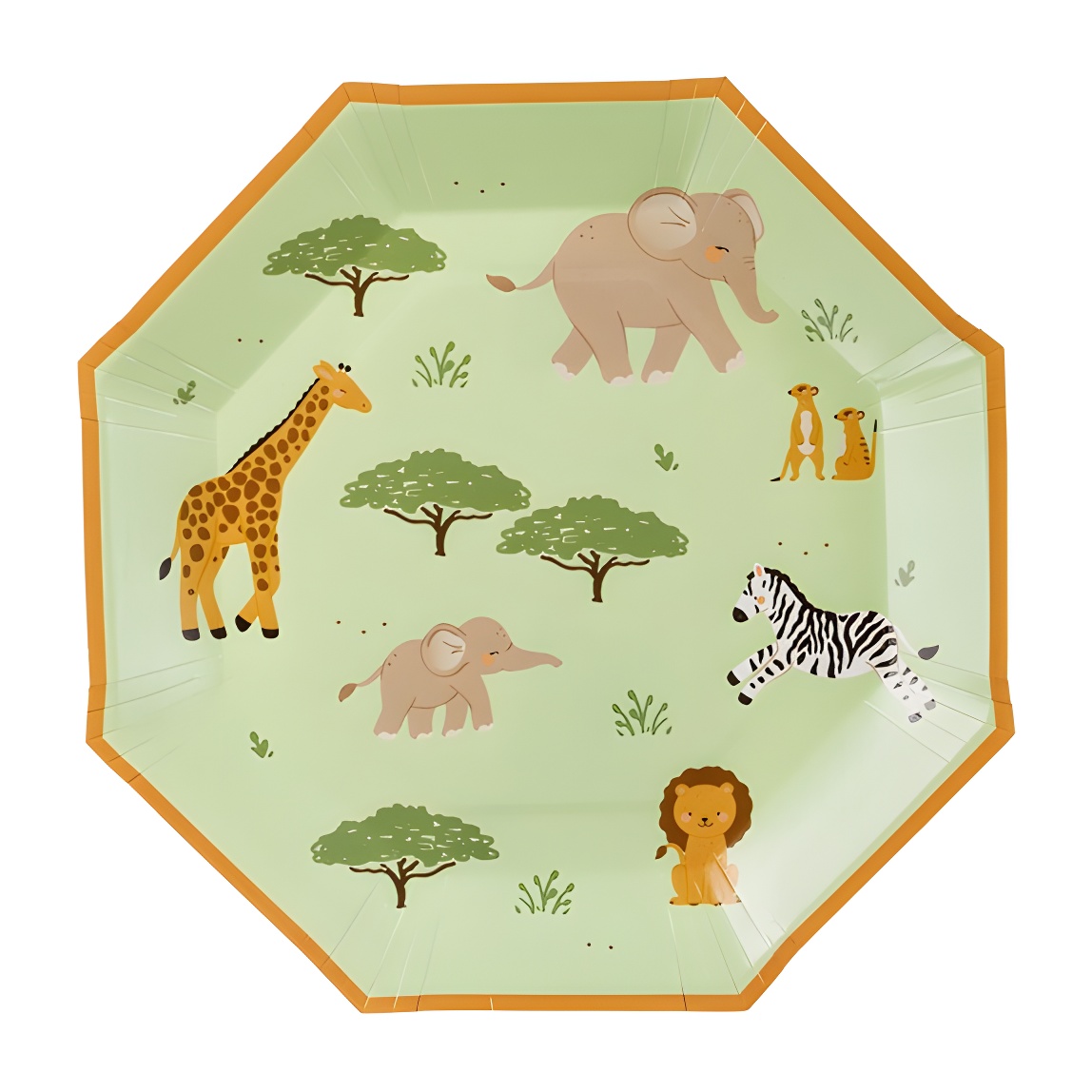 Platos de papel con un alegre diseño safari en tonos verdes y borde naranja. Ilustraciones de animales (elefante, jirafa, cebra y león) que aportan diversión a mesas infantiles. Producto pensado para complementar la decoración de fiestas y meriendas infantiles.