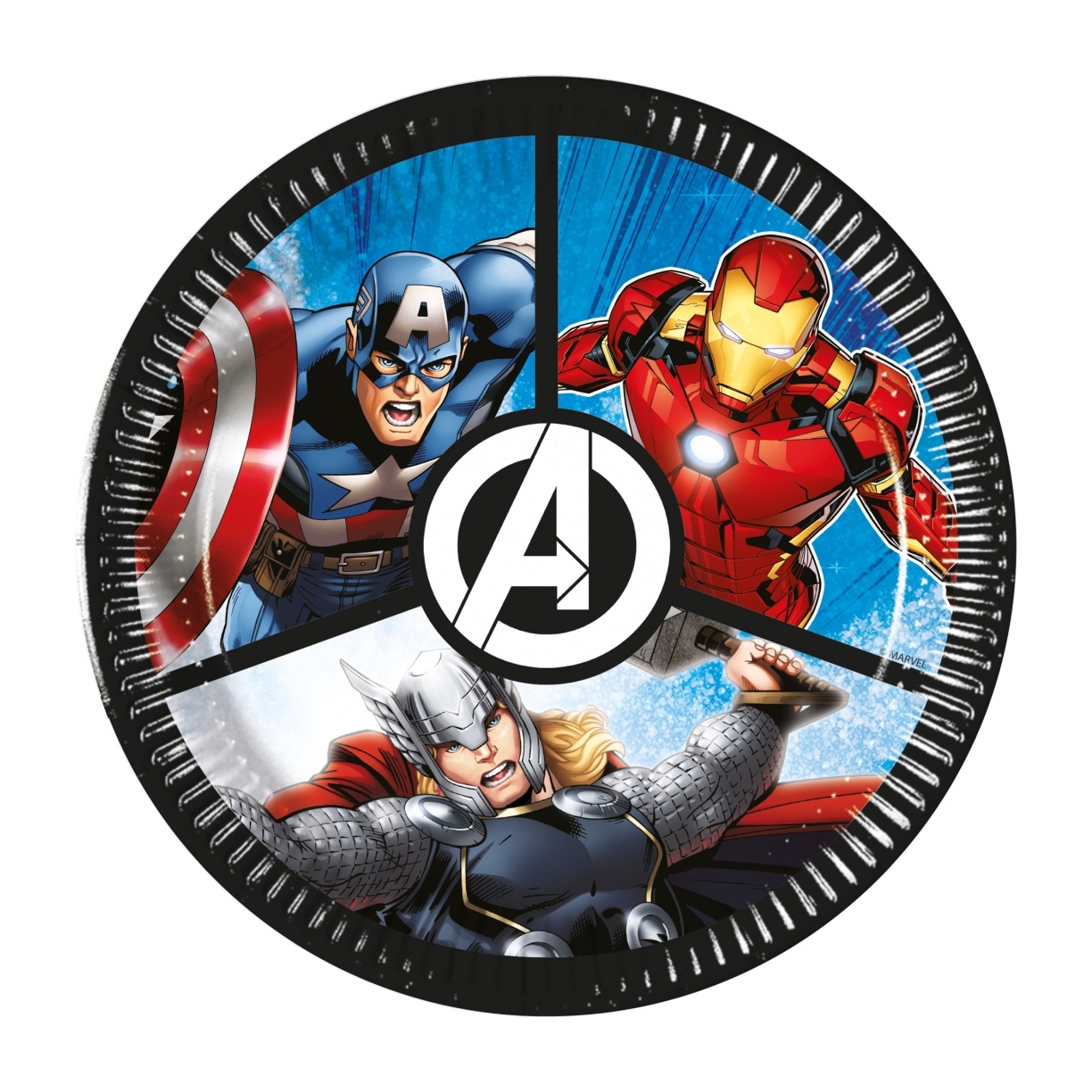 Pack de 8 platos de 20 cm con diseño oficial de Los Vengadores, pensado para mesas infantiles.