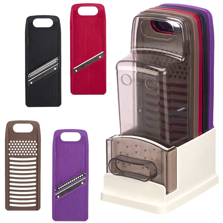 • Incluye varios tipos de ralladores y un soporte para tenerlo organizado.