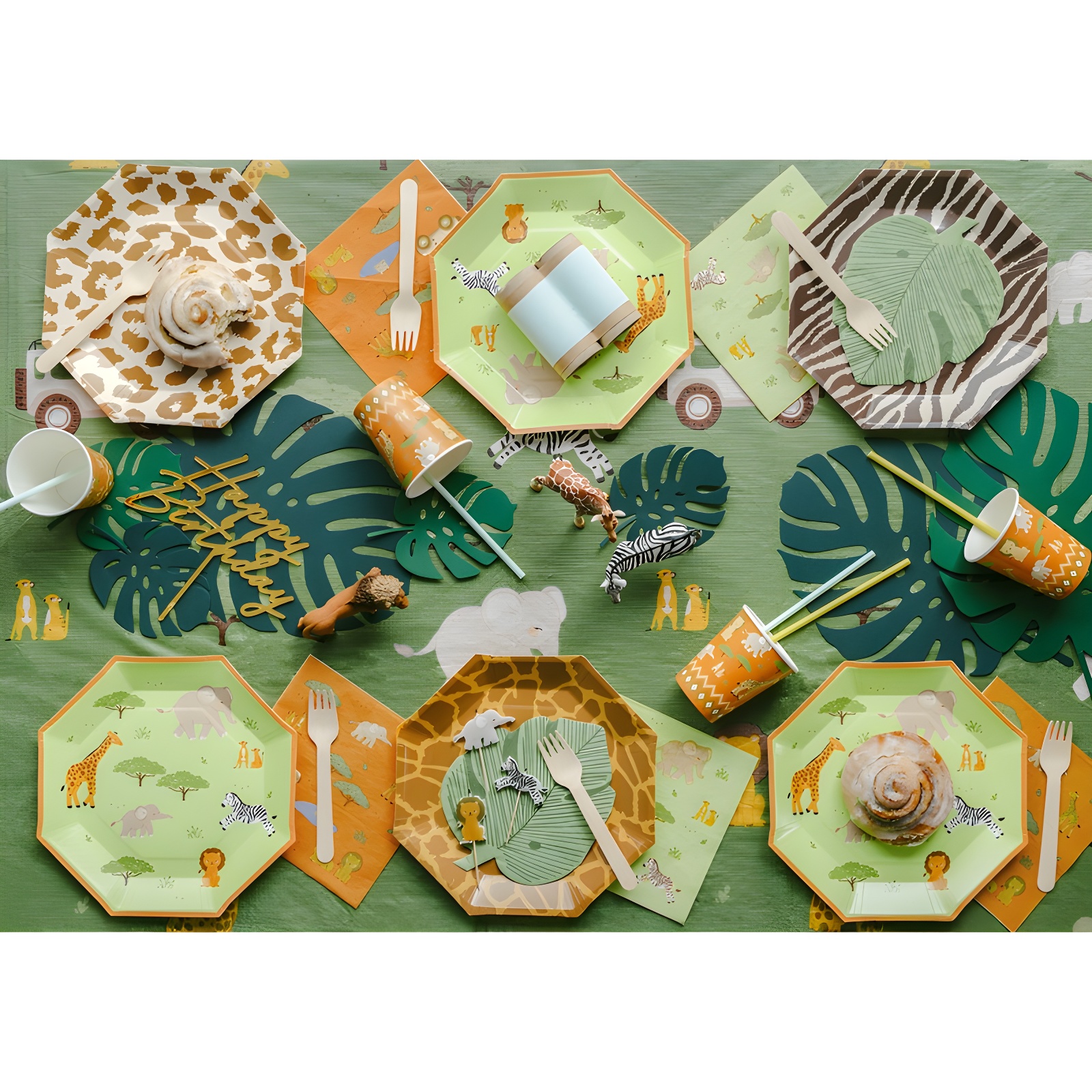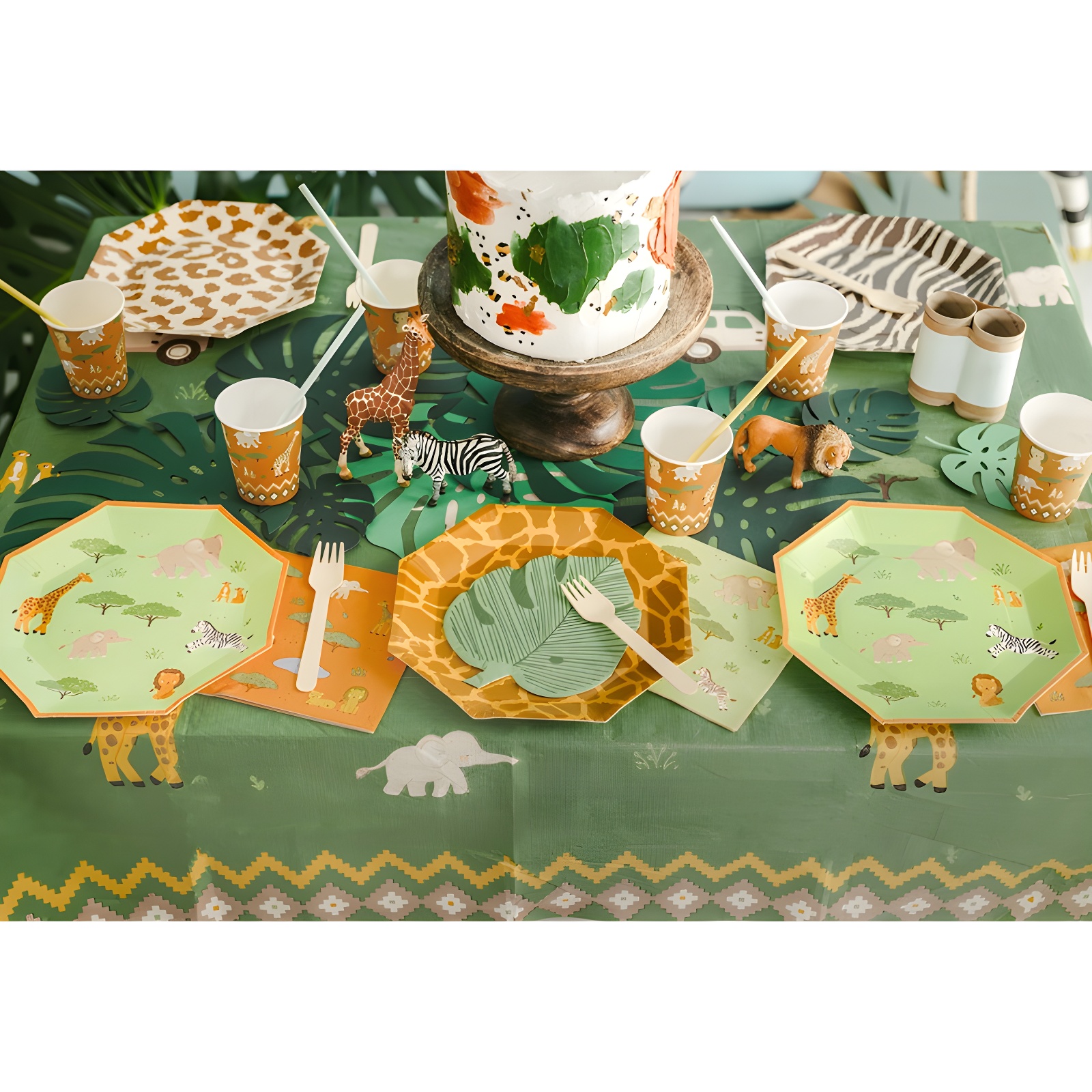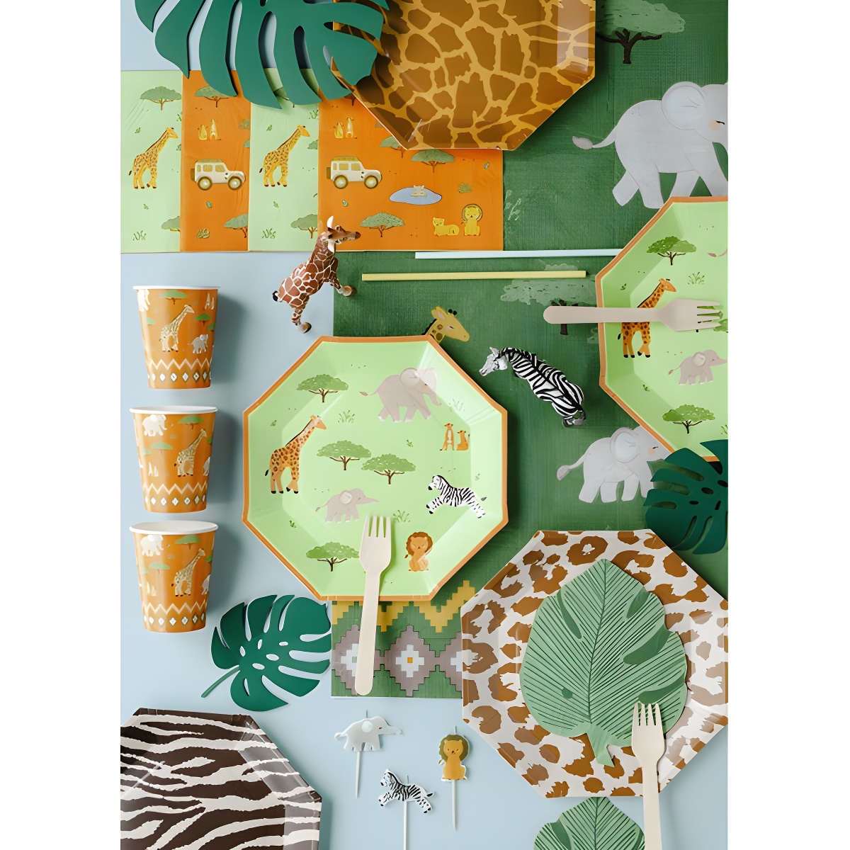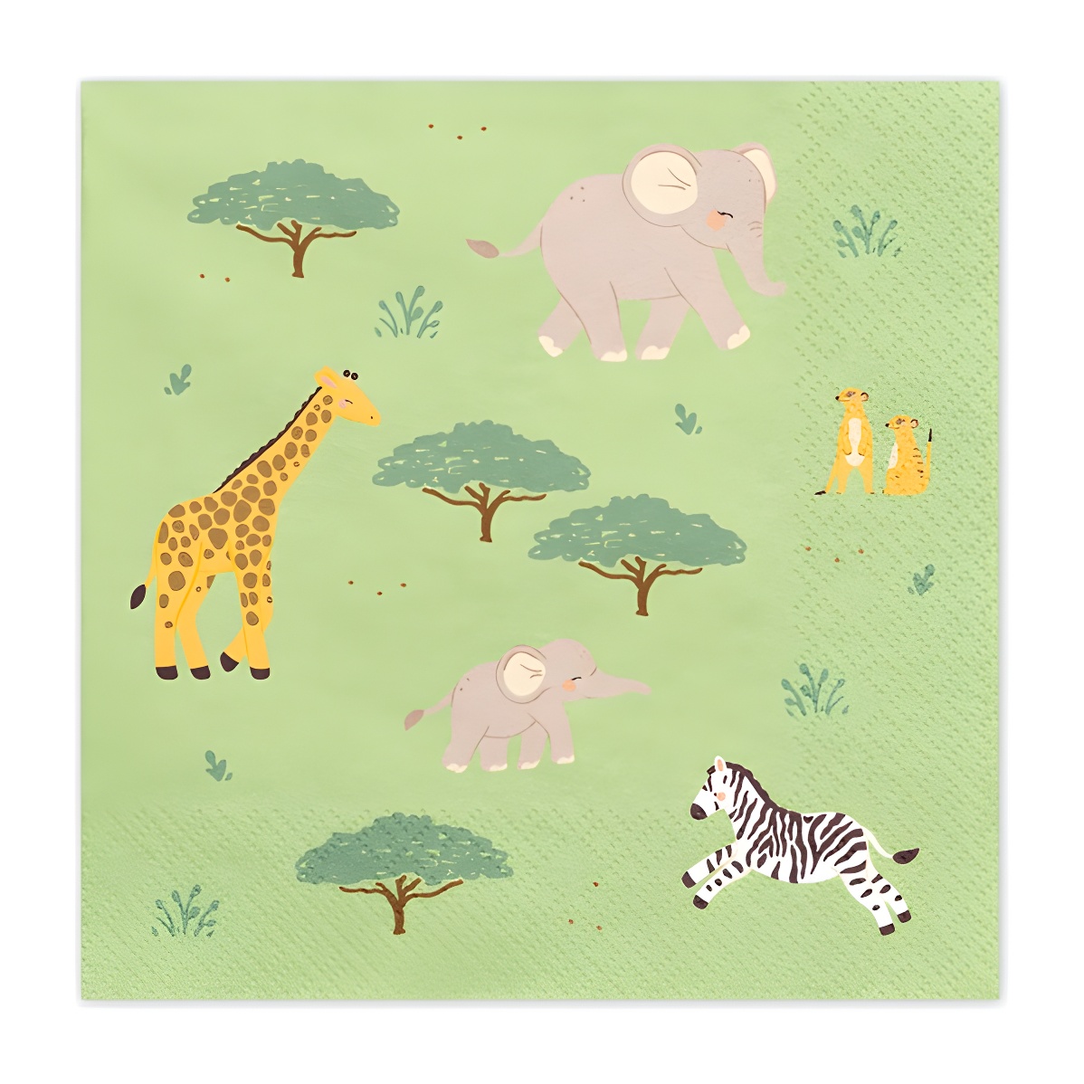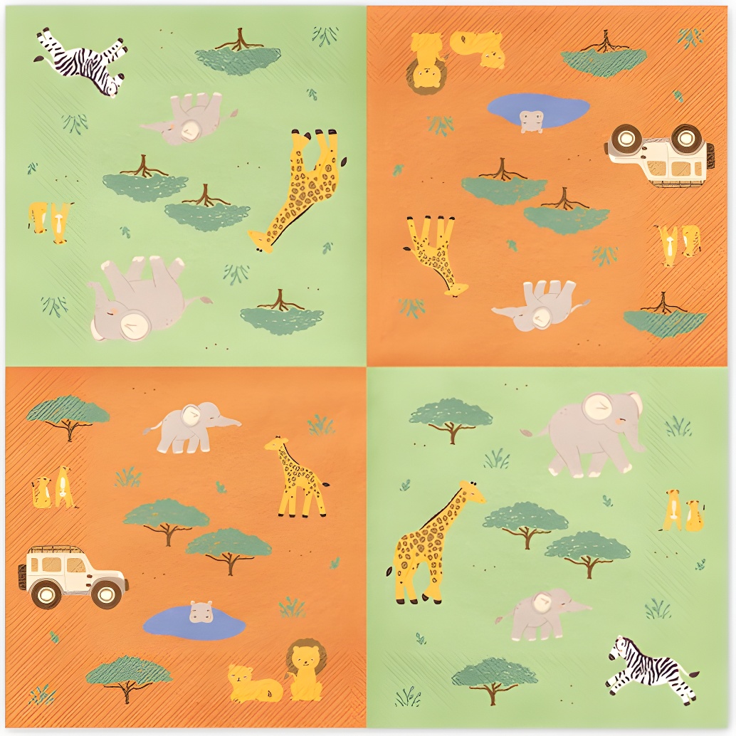 Servilletas con un alegre estampado safari que incluye jirafa, elefante, cebra y otros animales, pensadas para ambientar fiestas infantiles.