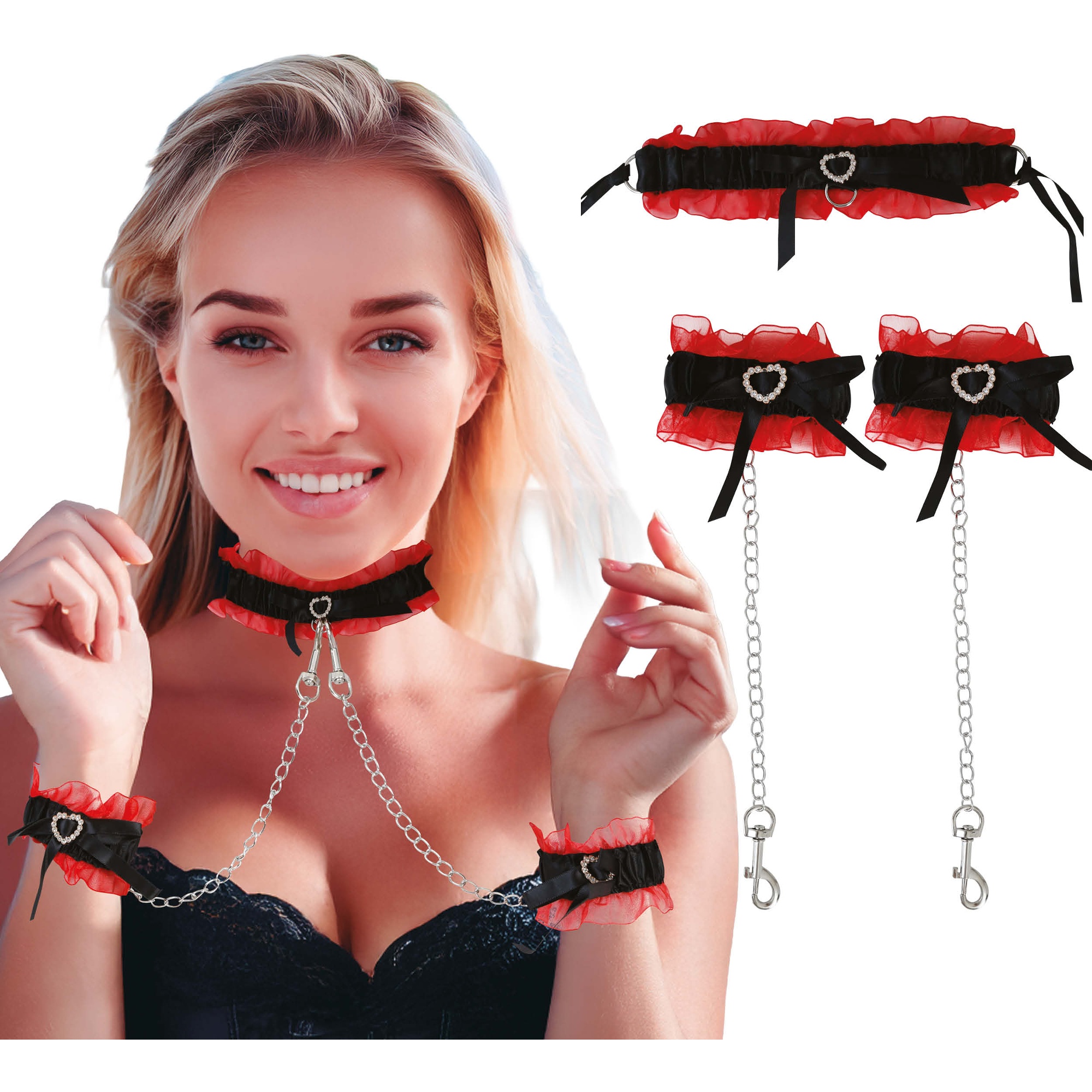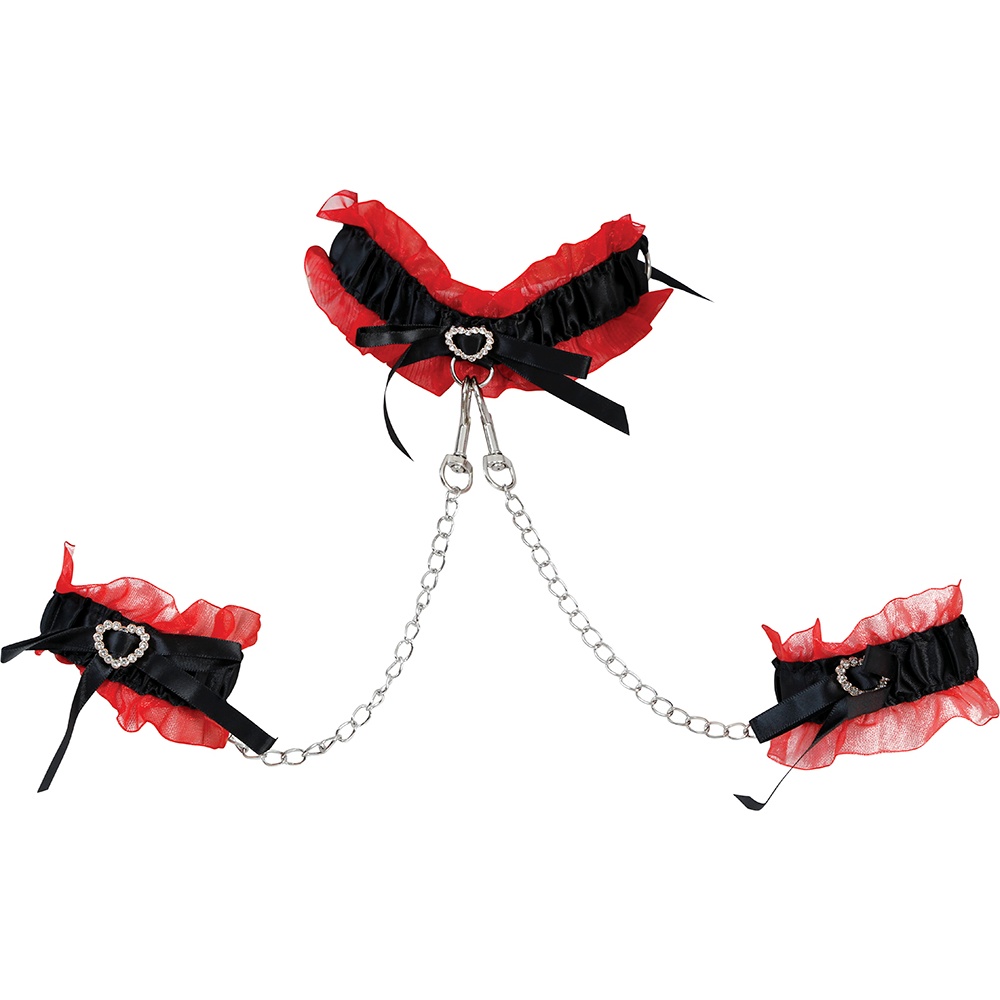 Set sensual de estilo burlesque diseñado para realzar cualquier look provocador. La combinación de volantes rojos, lazos negros y detalles metálicos aporta un contraste elegante y llamativo. Las cadenas aportan un efecto dramático y pueden retirarse según el estilo deseado. Ajustable y cómodo, pensado para sesiones fotográficas, shows o noches especiales donde quieras destacar.