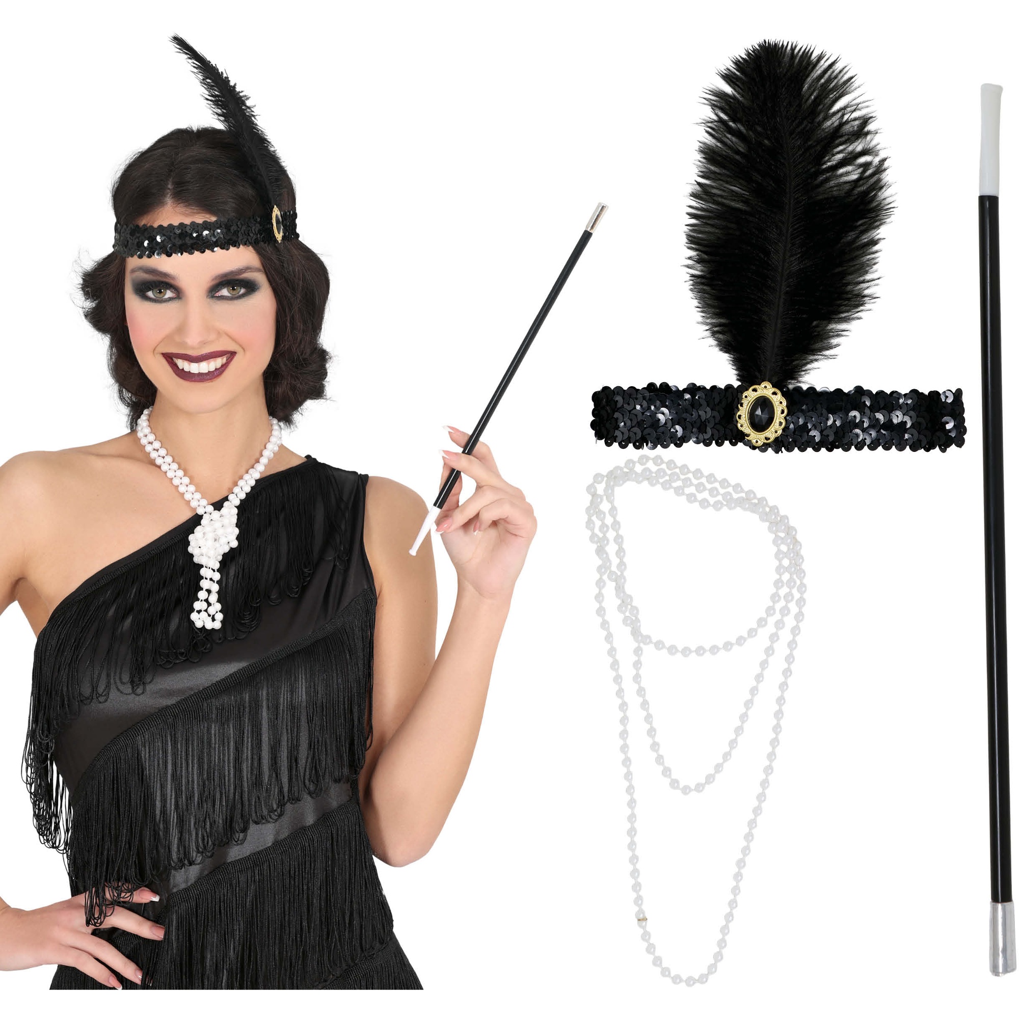 Consigue un look Charleston auténtico y sofisticado. Este conjunto aporta el toque retro y elegante de los años 20 para tus fiestas temáticas, carnavales o despedidas. Diseñado para complementar vestidos de flecos y estilismos vintage, realza cualquier outfit con un aire festivo y glamuroso. Perfecto para sesiones de fotos y eventos donde quieras destacar con estilo.