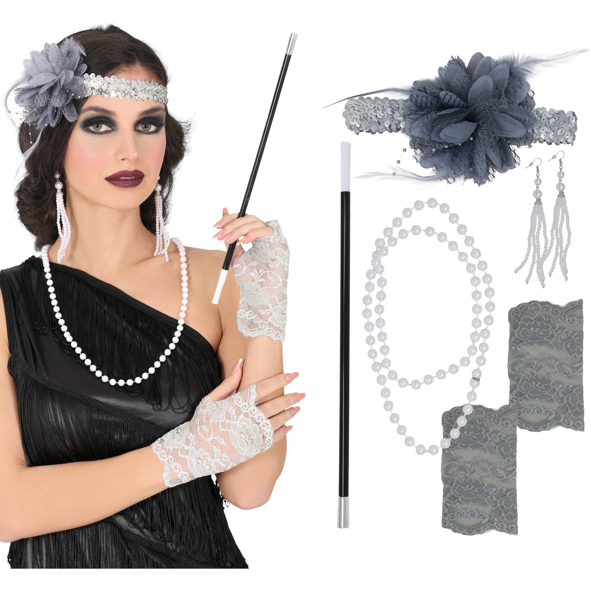 Consigue un look Charleston auténtico con este elegante set de accesorios inspirado en los años 20. Diseñado para aportar un toque de glamour vintage, combina brillo, encaje y plumas para un acabado sofisticado. Piezas ligeras y cómodas que realzan cualquier conjunto de época y añaden movimiento y estilo. Perfecto para completar un outfit retro en eventos temáticos, sesiones de fotos o celebraciones especiales. Materiales sintéticos que mantienen el brillo y la forma.