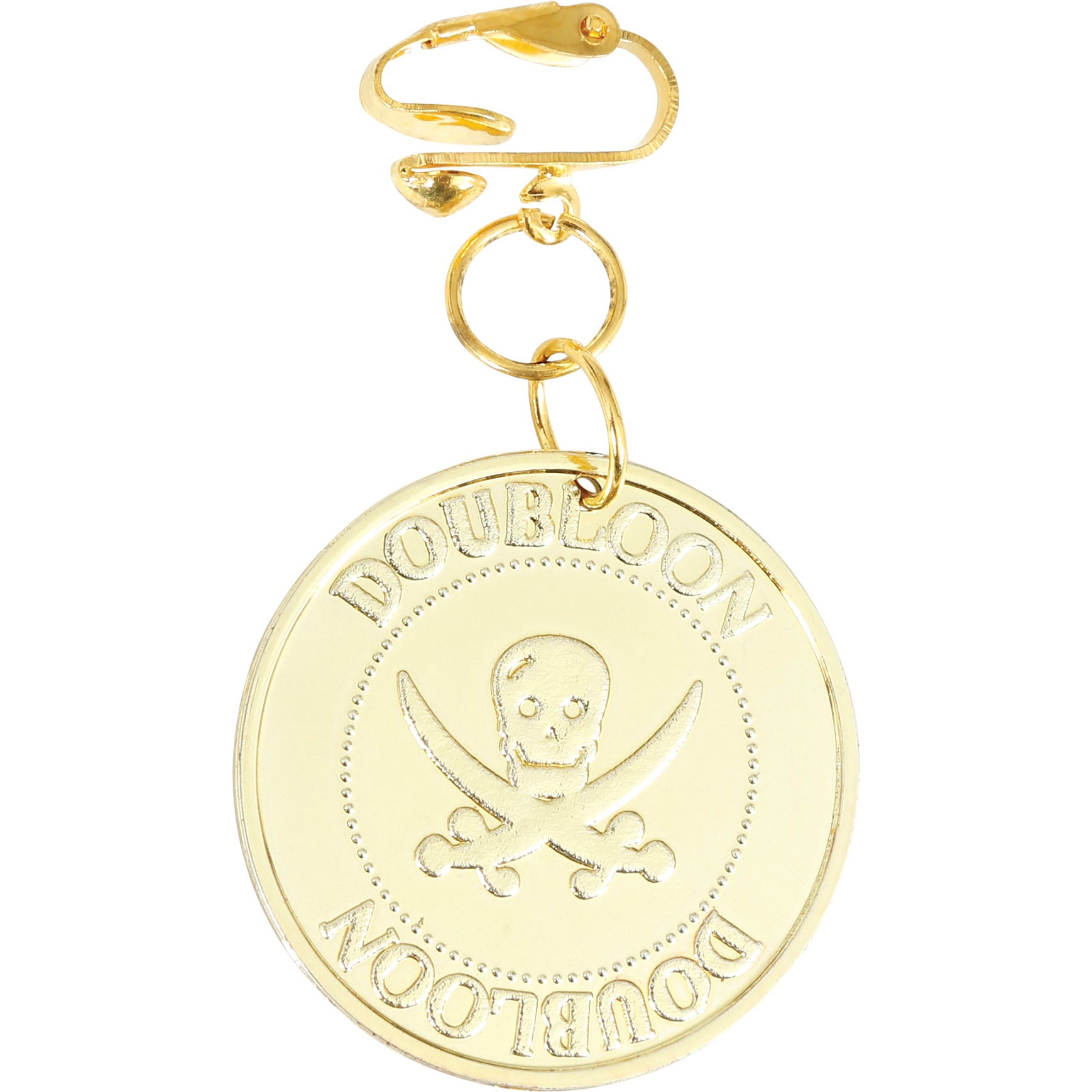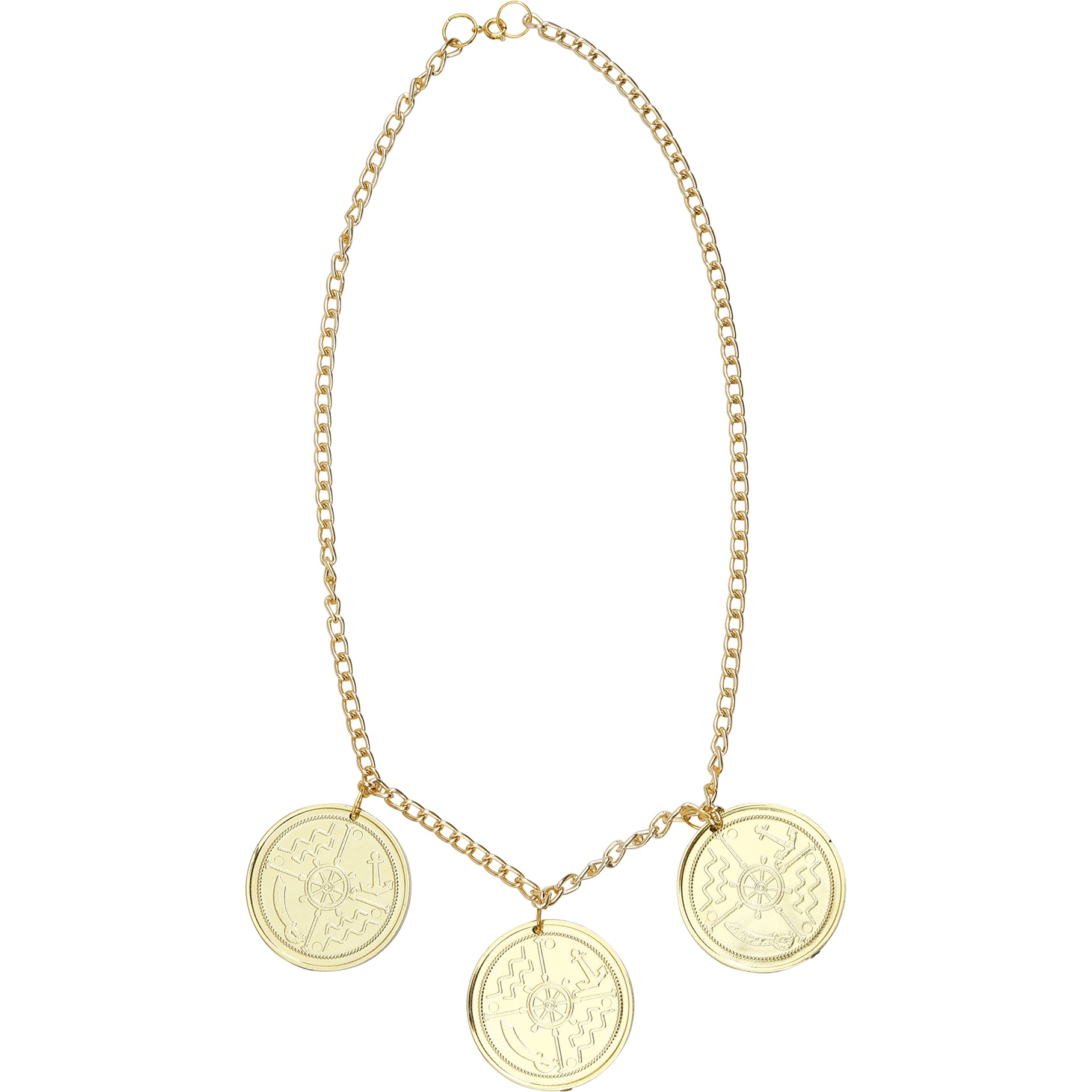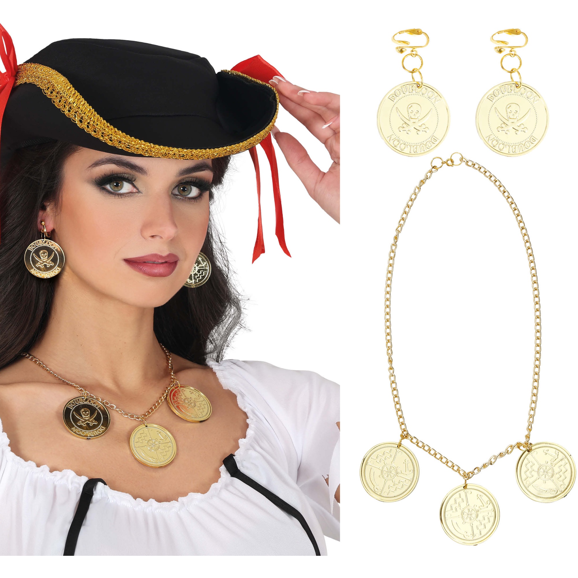 Set de collar y pendientes con monedas de estilo pirata, diseñado para mujer adulta. Presenta un acabado dorado que simula monedas antiguas y aporta un toque teatral y llamativo a tu look. Fabricado en PVC ligero para llevar con comodidad durante fiestas y eventos. Ideal para Carnaval y fiestas temáticas, aporta un punto de carácter a cualquier atuendo pirata. Fácil de combinar con sombreros, blusas y otros accesorios de disfraces.