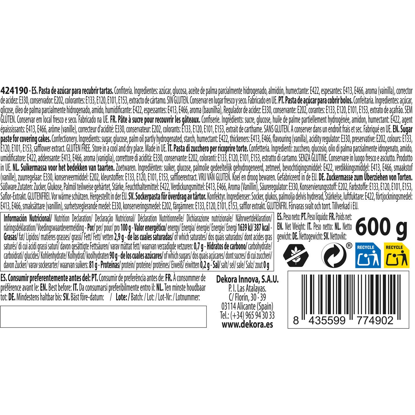 Ingredientes: Aceite vegetal parcialmente hidrogenado, Almidón, Aroma (vainilla), Azúcar, Extracto de cártamo, Glucosa, Colorantes: E101, E120, E133, E153, Espesante: E413, E466, Humectante: E422, Acidulante: E330, Conservantes: E202.