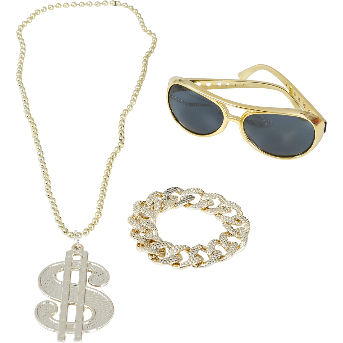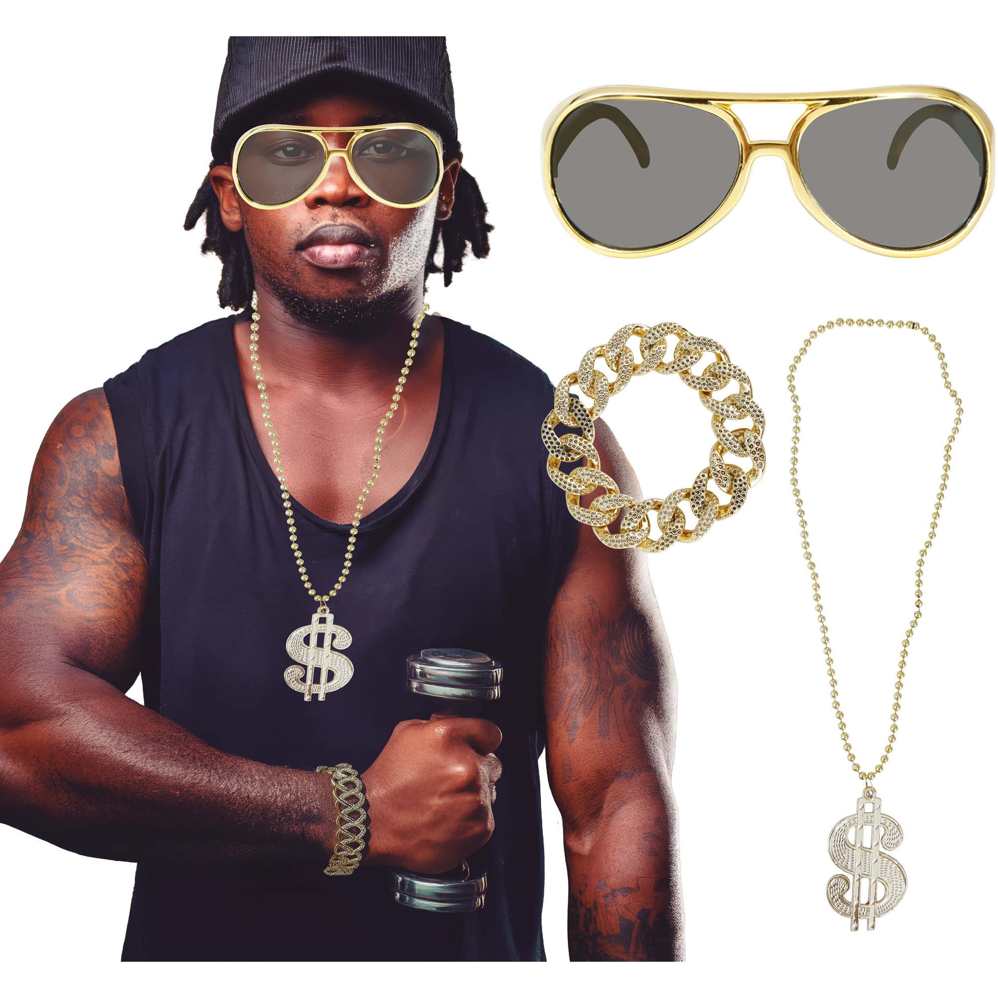 Set Rey del Hip Hop diseñado para destacar en disfraces y fiestas temáticas. Acabado dorado y estilo llamativo que recrea el clásico look urbano del hip hop, ideal para Carnaval, despedidas y photocalls. Complementa tu atuendo con un toque extravagante y divertido pensado para uso ocasional en eventos para adultos.