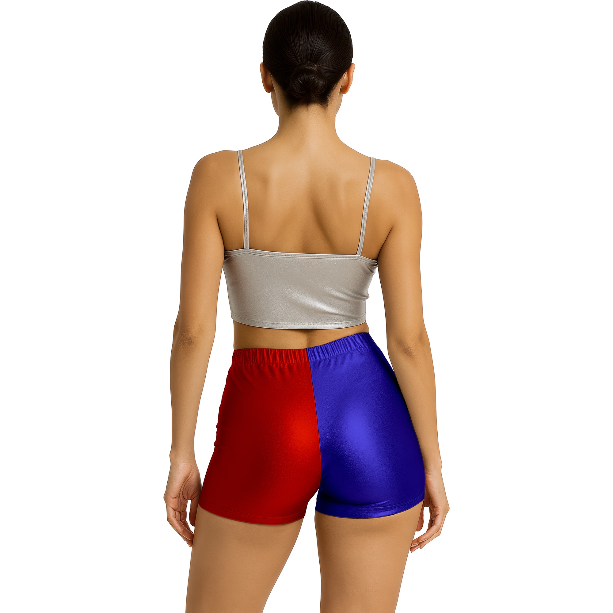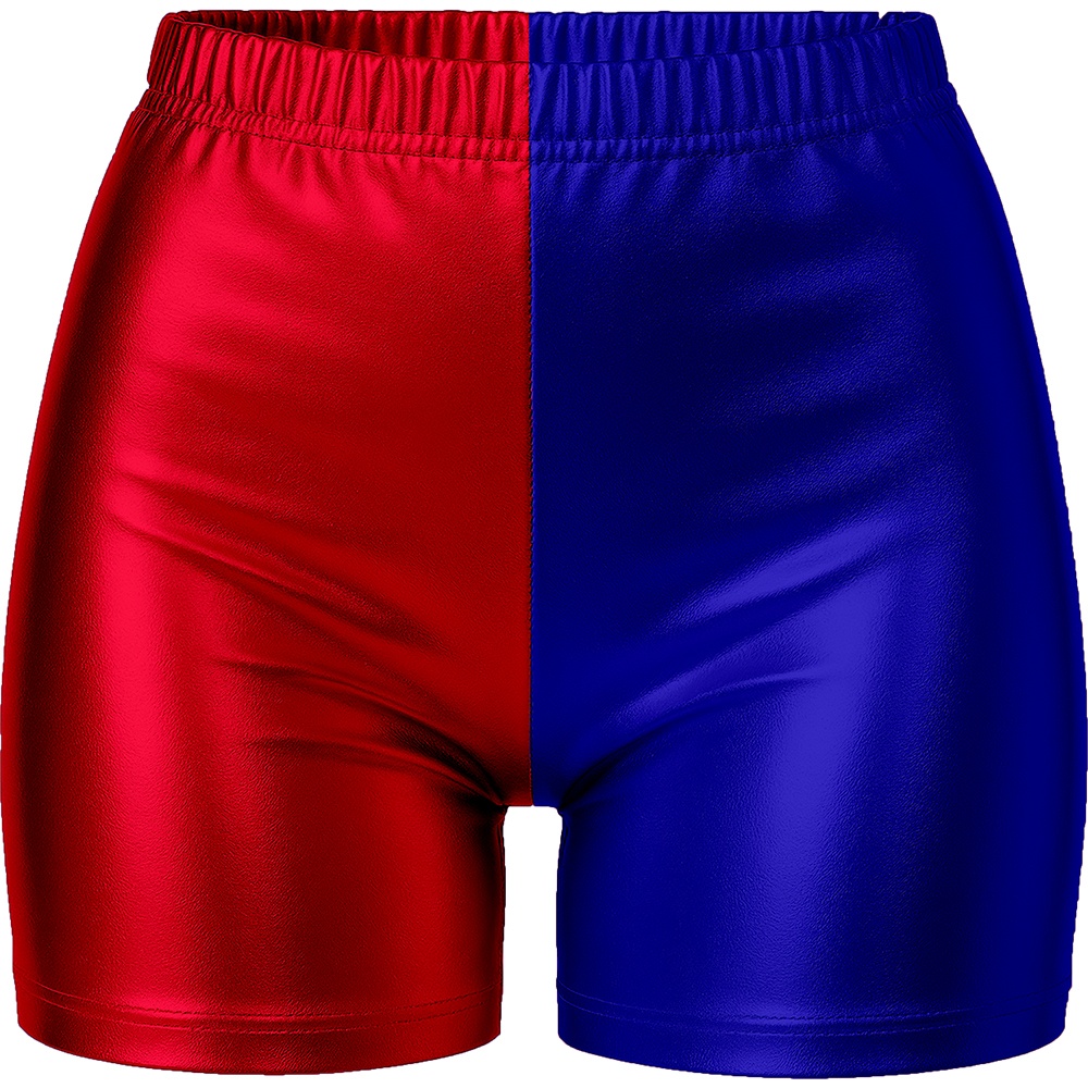 Shorts cortos con acabado metálico en bloque rojo y azul, inspirados en el icónico estilo de Harley Quinn. Corte ajustado y cintura elástica que ofrecen un ajuste cómodo y favorecedor. Tejido de poliéster con brillo satinado que destaca en fiestas, cosplay y sesiones fotográficas. Perfectos para combinar con tops y accesorios temáticos y conseguir un conjunto llamativo en Carnaval y eventos de disfraces.