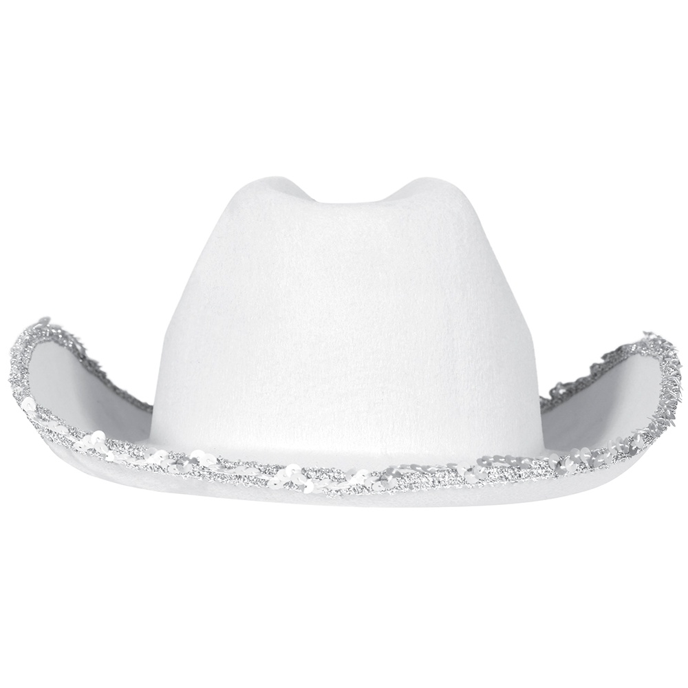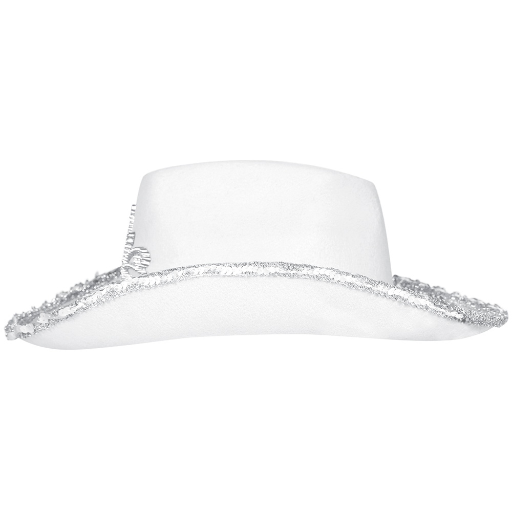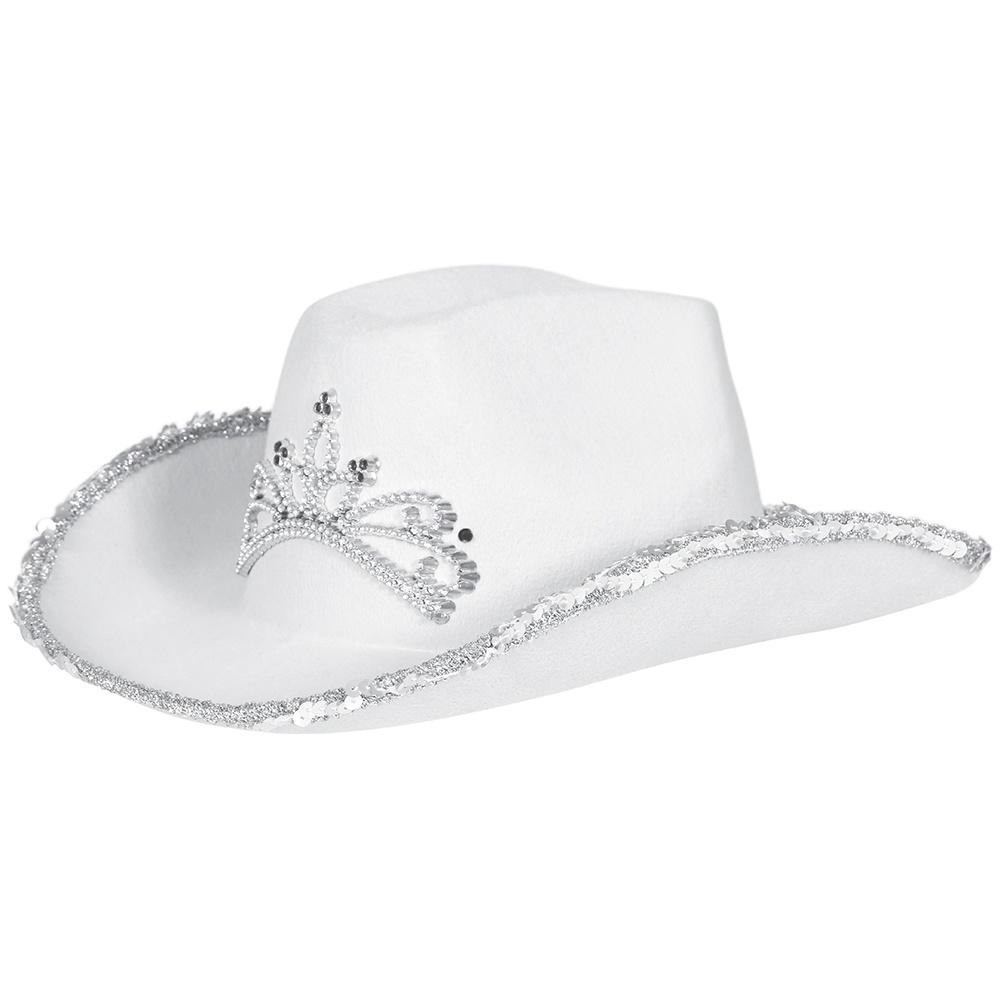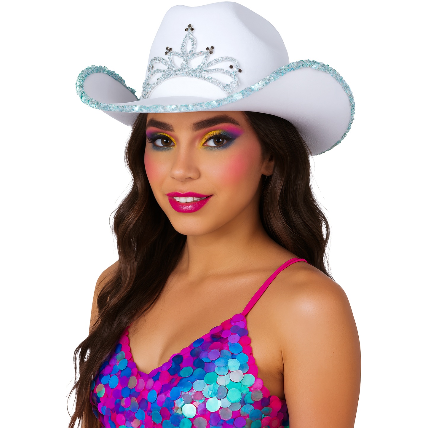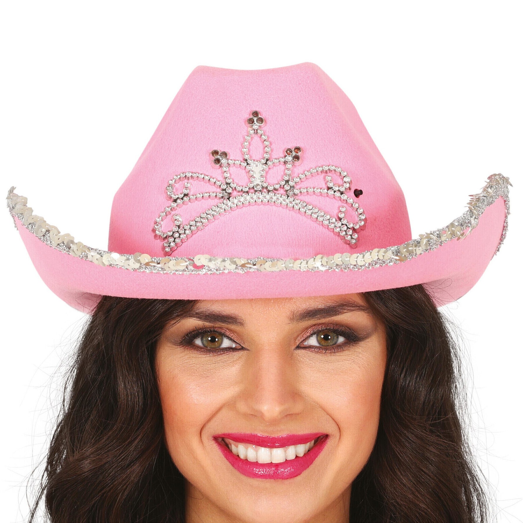 Sombrero vaquera rosa con una elegante corona de strass y borde decorado con lentejuelas. Combina el estilo cowboy clásico con un toque femenino y brillante.