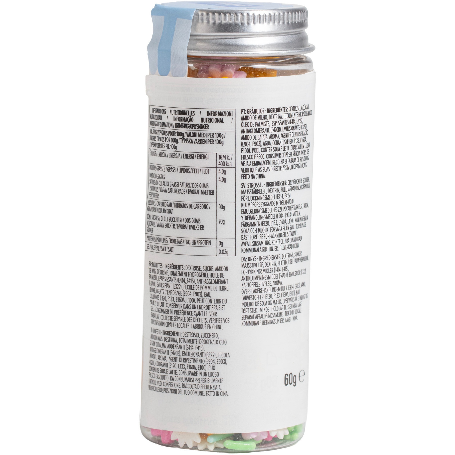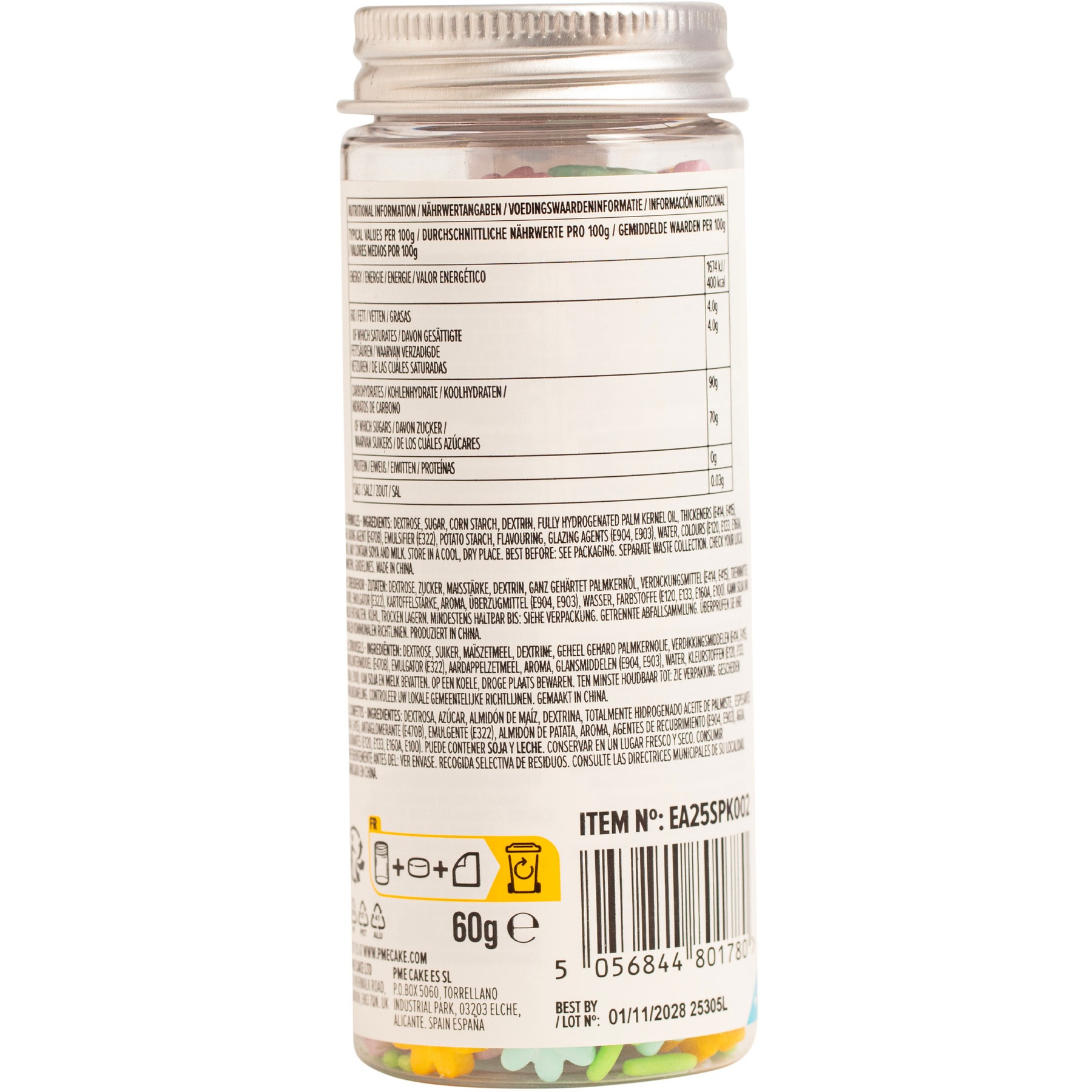 Ingredientes: azúcar, almidón de maíz, totalmente hidrogenado aceite de palmiste, dextrina, emulgente (E322), almidón de patata, espesante (E415), agentes de recubrimiento (E904, E903), agua, colorantes (E160A, E100, E133, E120).