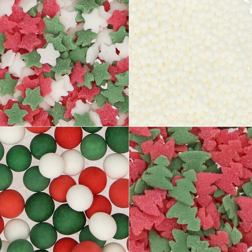 - Estrellas rojas, verdes y blancas, nonpareils blancos, árboles de Navidad rojos y verdes, perlas rojas, verdes y blancas.