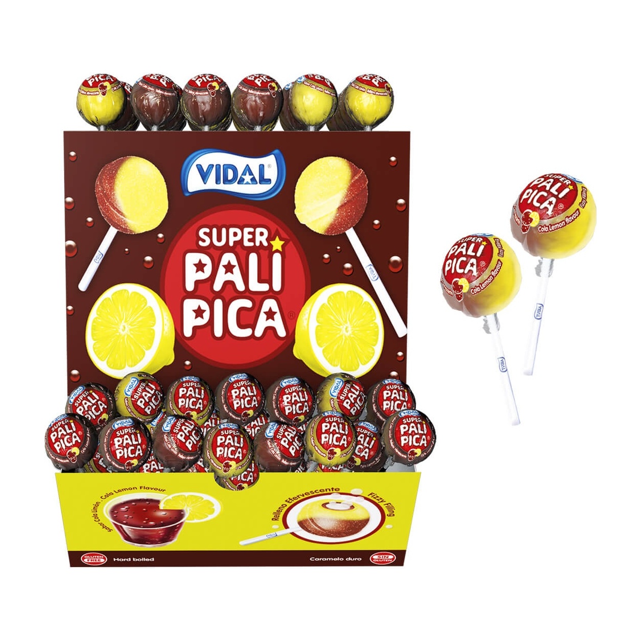 Pack para fiestas y tiendas: atractivos y ácidos caramelos con palo y corazón de chicle que combinan sabores chispeantes a cola y limón. Ideal para los más atrevidos, ofrece una explosión de sabor con textura masticable en su interior y una cubierta ácida vibrante.